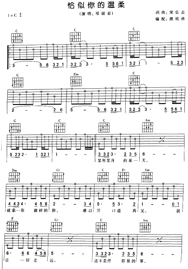 曲谱介绍:   恰似你的温柔,是知名音乐人梁弘志先生的第一首音乐作品,由台湾歌手潘安邦于1979年首唱,其后先后被众多华语歌手翻唱,其中以邓丽君和蔡琴的版本最为著名。1996年,大陆当红歌手杨钰莹在她的专辑《为你带来一片温柔》中收录了此歌曲。