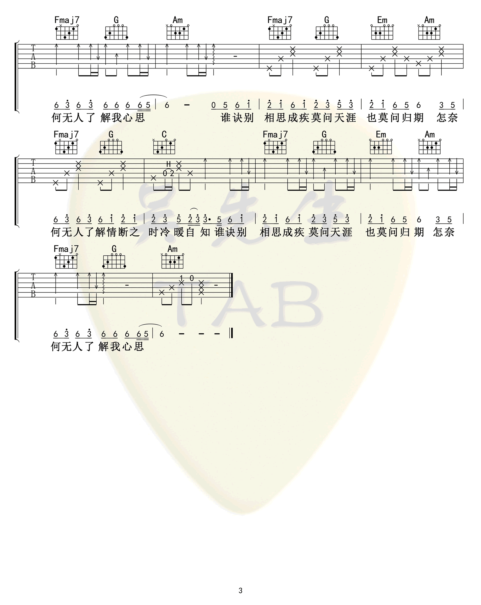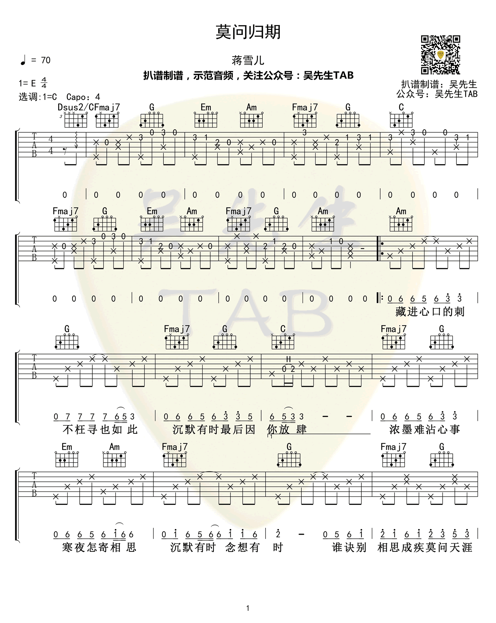 曲谱介绍: 《莫问归期》吉他谱,蒋雪儿演唱的一首古风歌曲,莫问归期六线谱,原调E选调C,CAPO夹第四品。三张高清图片谱。感谢吴先生编配出品,上传分享。