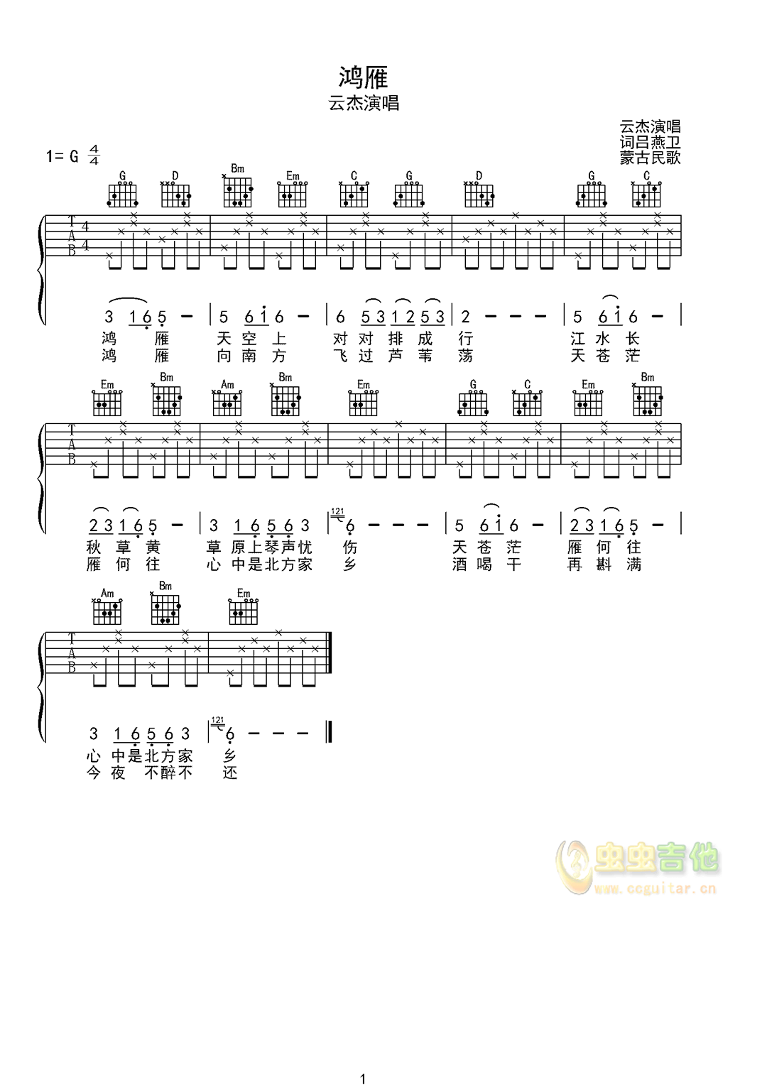 曲谱介绍: 《鸿雁》吉他弹唱谱,共有1张高清图谱,免翻页排版设计。