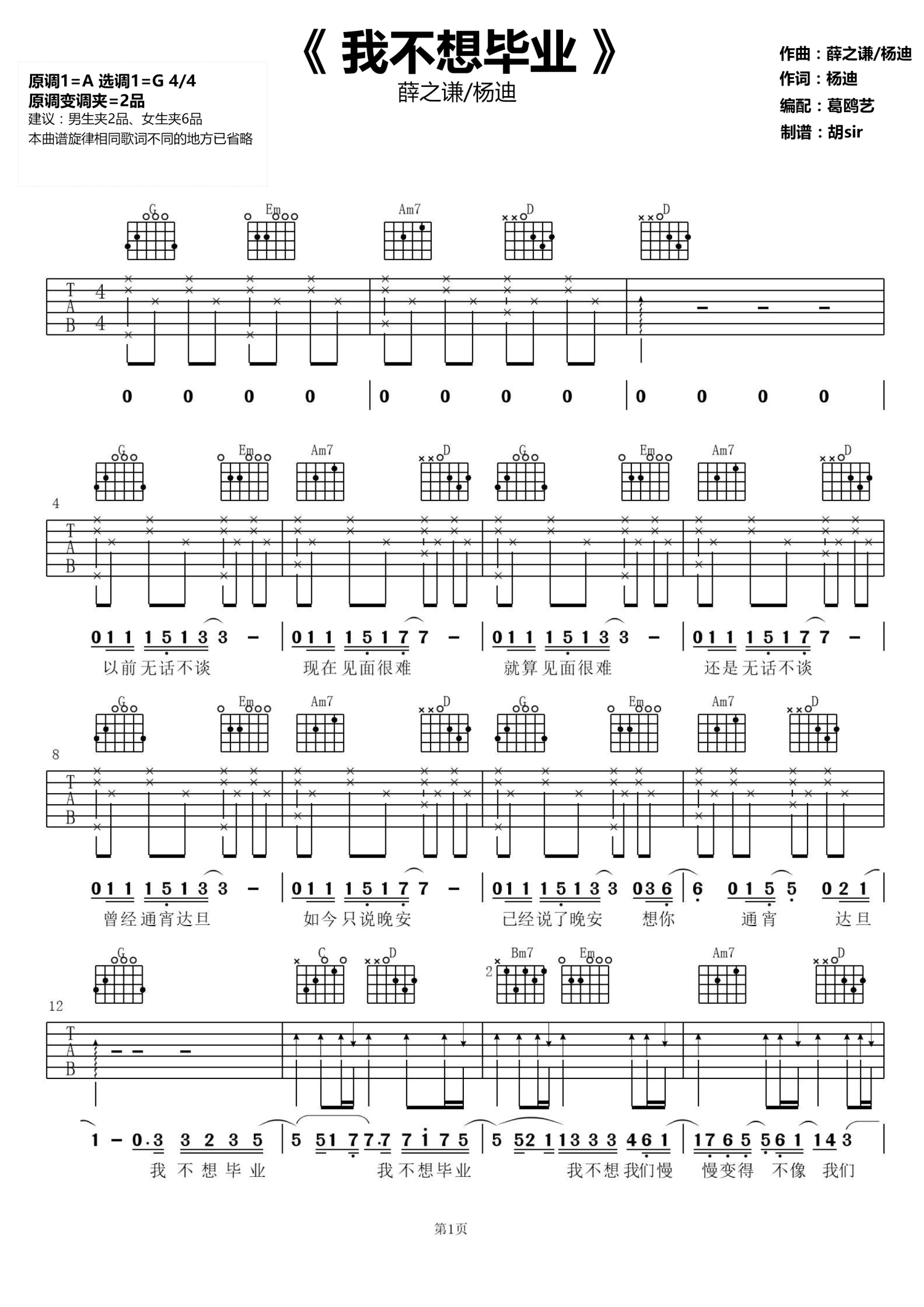 • 我不想毕业吉他谱 - 薛之谦/杨迪 - G调吉他弹唱谱第1张