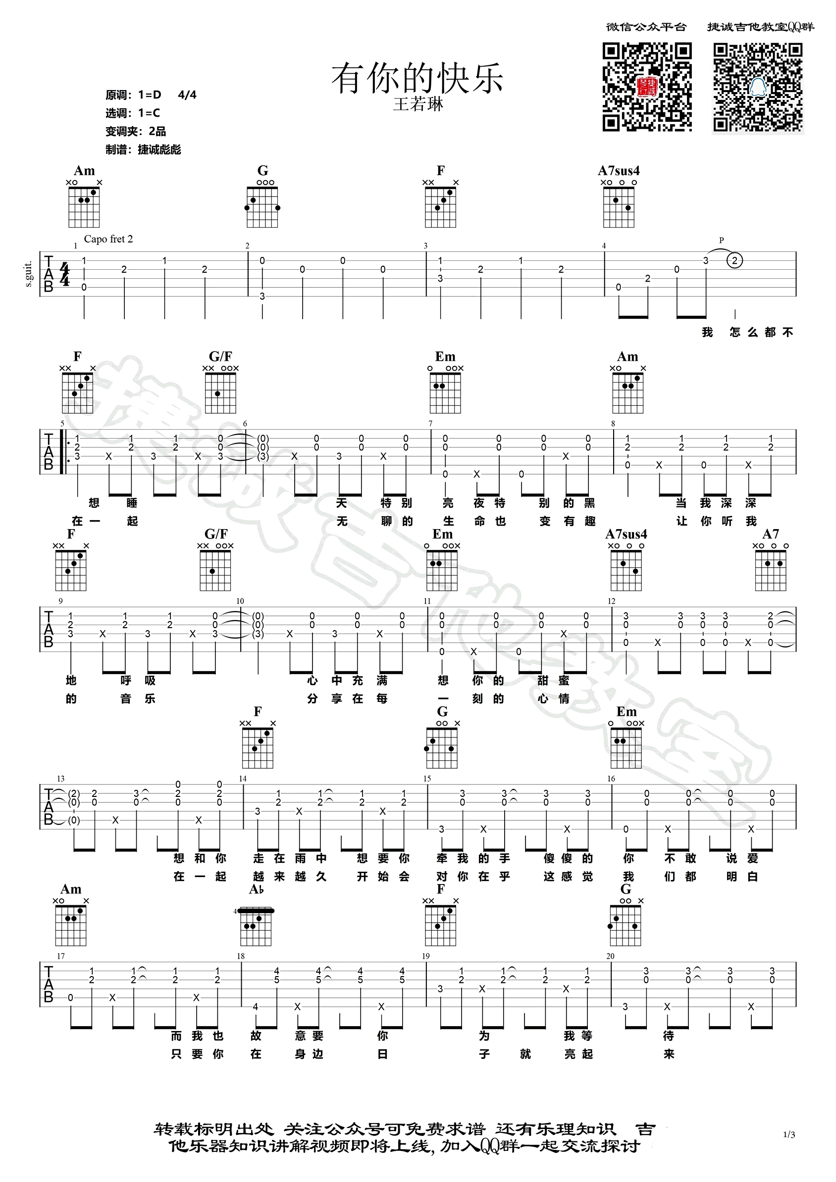 曲谱介绍: 《有你的快乐》吉他谱,王若琳演唱的一首代表歌曲,有你的快乐吉他六线谱,原调D选调C,变调夹夹二品。三张弹唱六线谱,捷诚吉他教室编配,彪彪老师并带来吉他弹唱演示视频,更新上传。