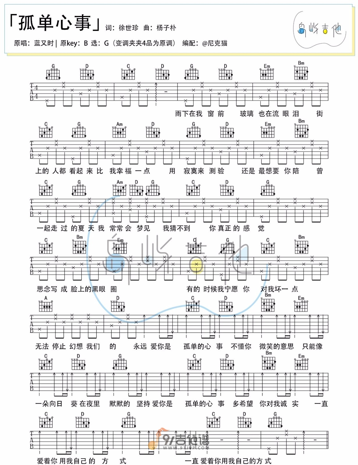 曲谱介绍: 曲谱简介:孤单心事吉他谱,蓝又时演唱的一首歌曲,4/4拍的节奏,这首歌曲的原调为B调,这里曲谱采用了G调指法进行编配,演唱时夹变调夹4品可回到原调,也可根据个人实际嗓音情况选择。曲谱由岛屿吉他编配出品。