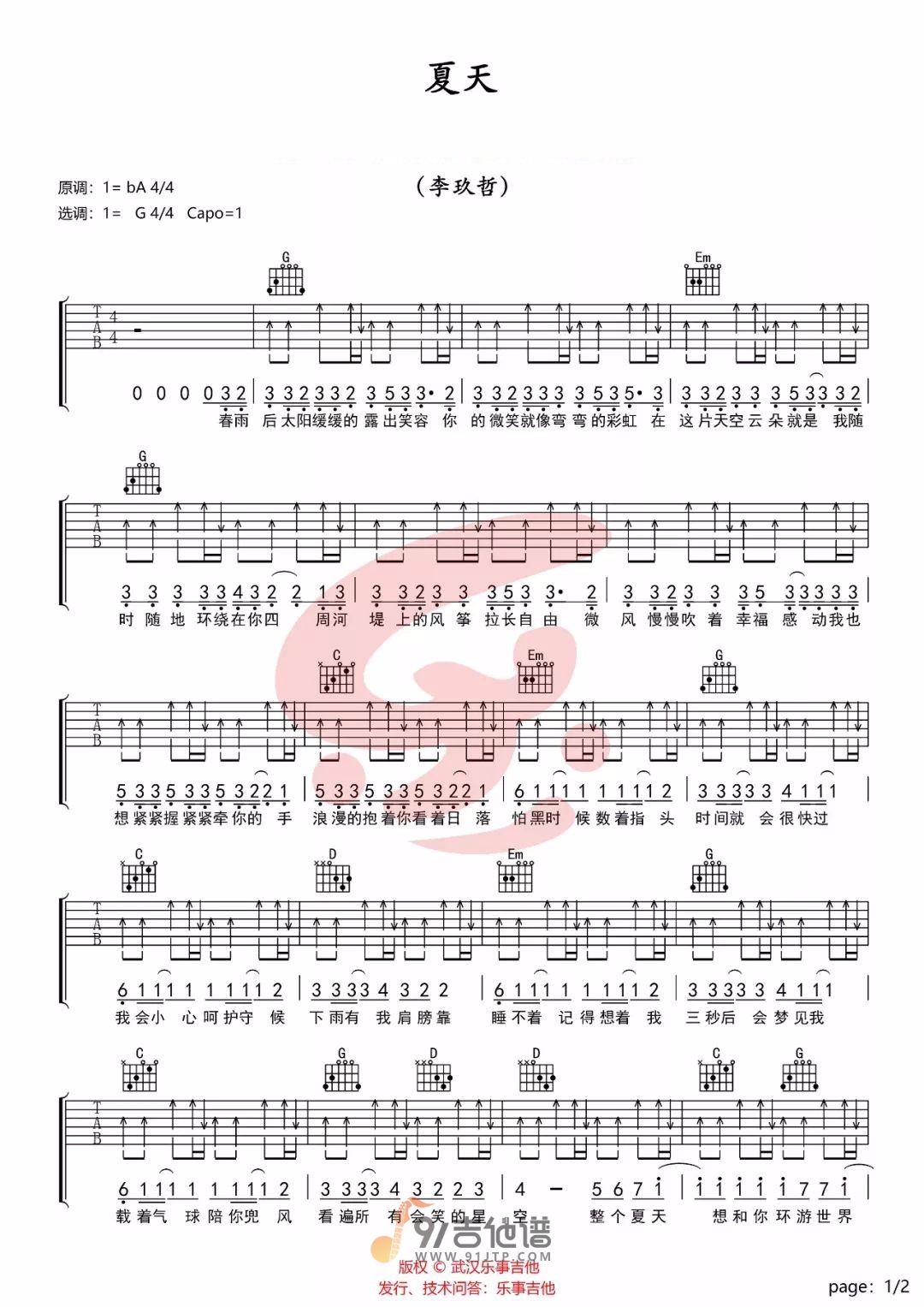 夏天吉他谱 - 李玖哲 - G调吉他弹唱谱 - 原版