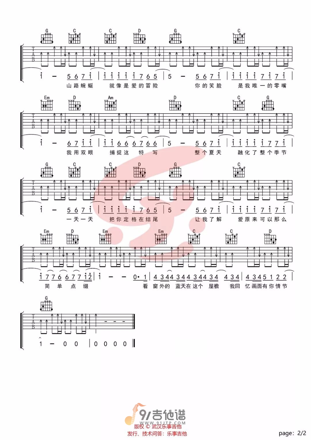 曲谱介绍: 曲谱简介:夏天吉他谱,李玖哲演唱的一首歌曲,4/4拍的节奏,这首歌曲的原调为降A调,这里曲谱采用了G调指法进行编配,演唱时夹变调夹1品可回到原调,也可根据个人实际嗓音情况选择。曲谱由乐事吉他编配出品。杰伦对这首歌曲的编曲实际上并没有刻意要掩盖周杰伦的味道,还因为李玖哲的出色演绎为歌曲添色不少,特别是副歌部分,李玖哲对假音的大量运用成为了整首歌的一个亮点,从而让歌曲的可听性提高到了一个新的层次。
