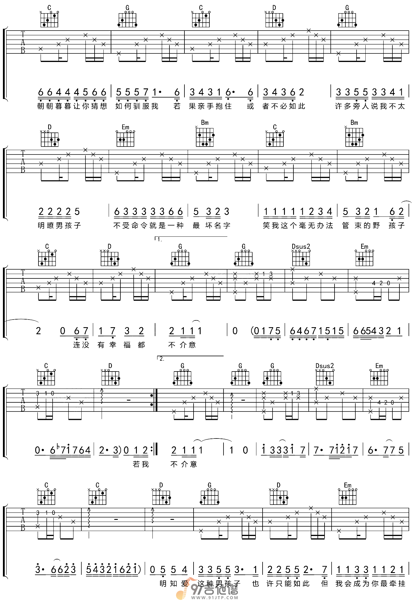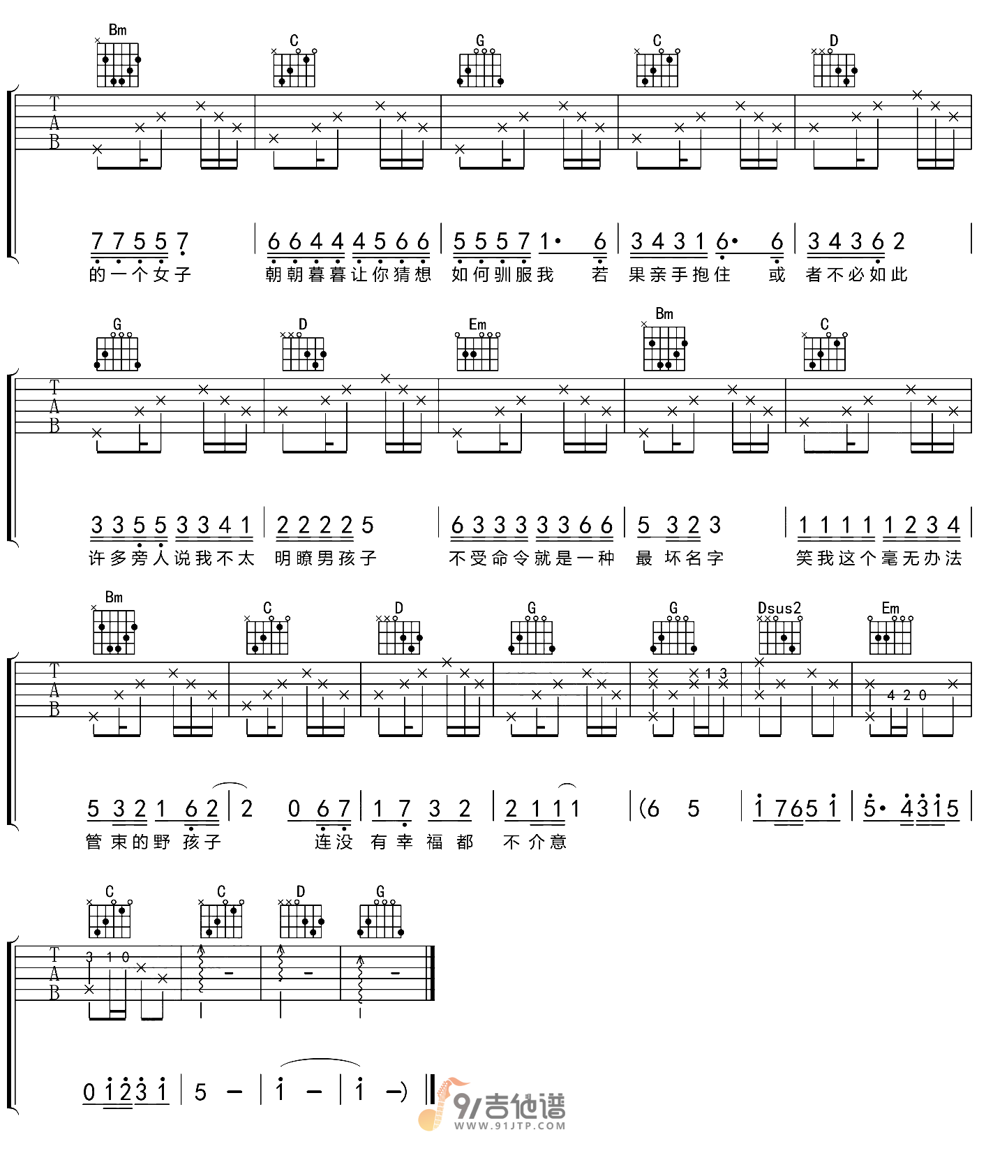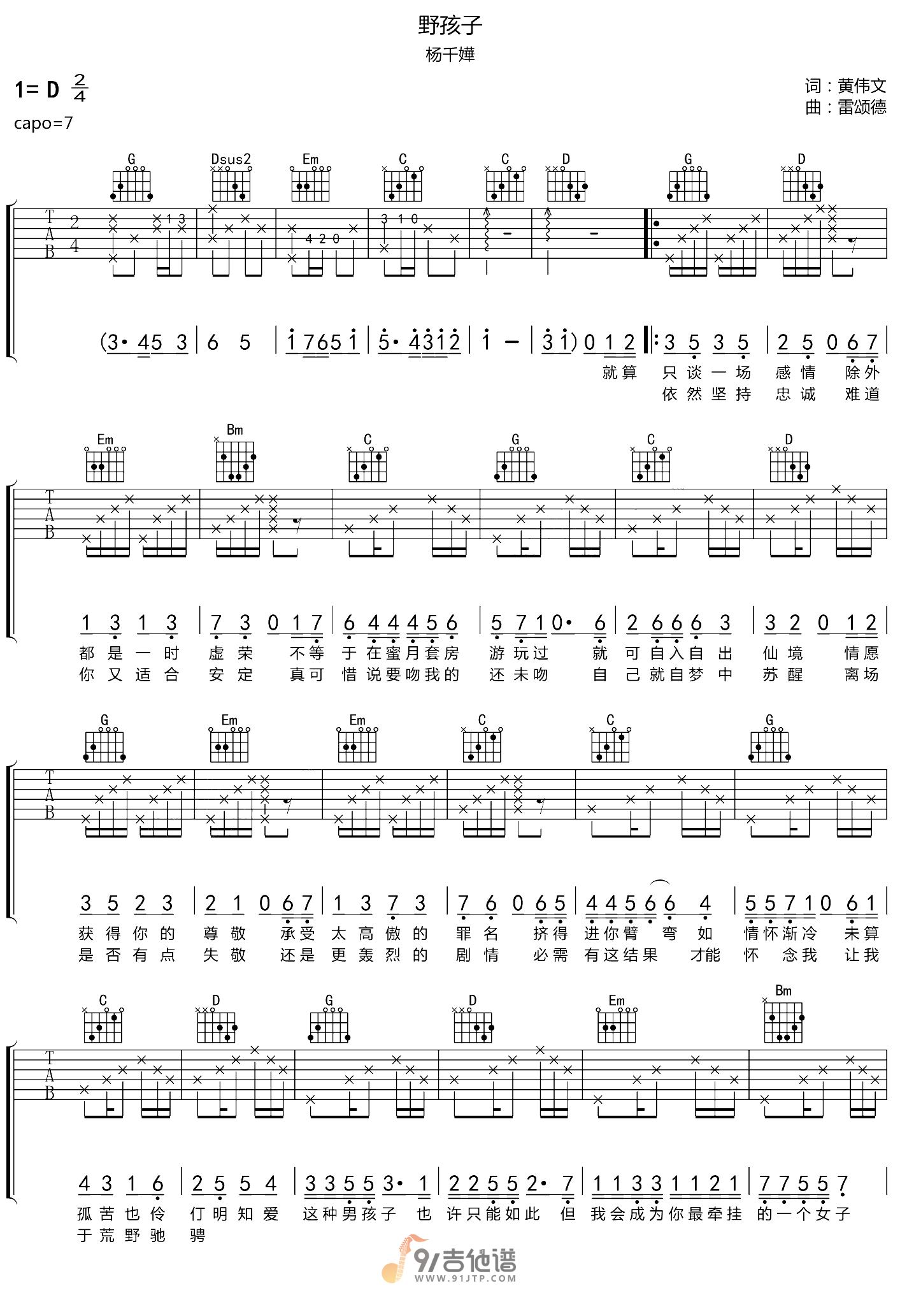曲谱介绍: 曲谱简介:野孩子吉他谱,杨千嬅演唱的一首歌曲,2/4拍的节奏,这首歌曲的原调为D调,这里曲谱采用了G调指法进行编配,演唱时夹变调夹7品可回到原调,也可根据个人实际嗓音情况选择。曲谱由琴谱网更新上传,共3张高清图片弹唱吉他谱例,曲谱来源于网络转载,编配制谱者暂不详。笑我这个毫无办法管束的野孩子,连没有幸福都不介意,这是《野孩子》这首歌里让人触动最大的一句歌词,明明有自己的个性,有自己的想法,但是在爱情里却不得不选择妥协,成全这份爱情。