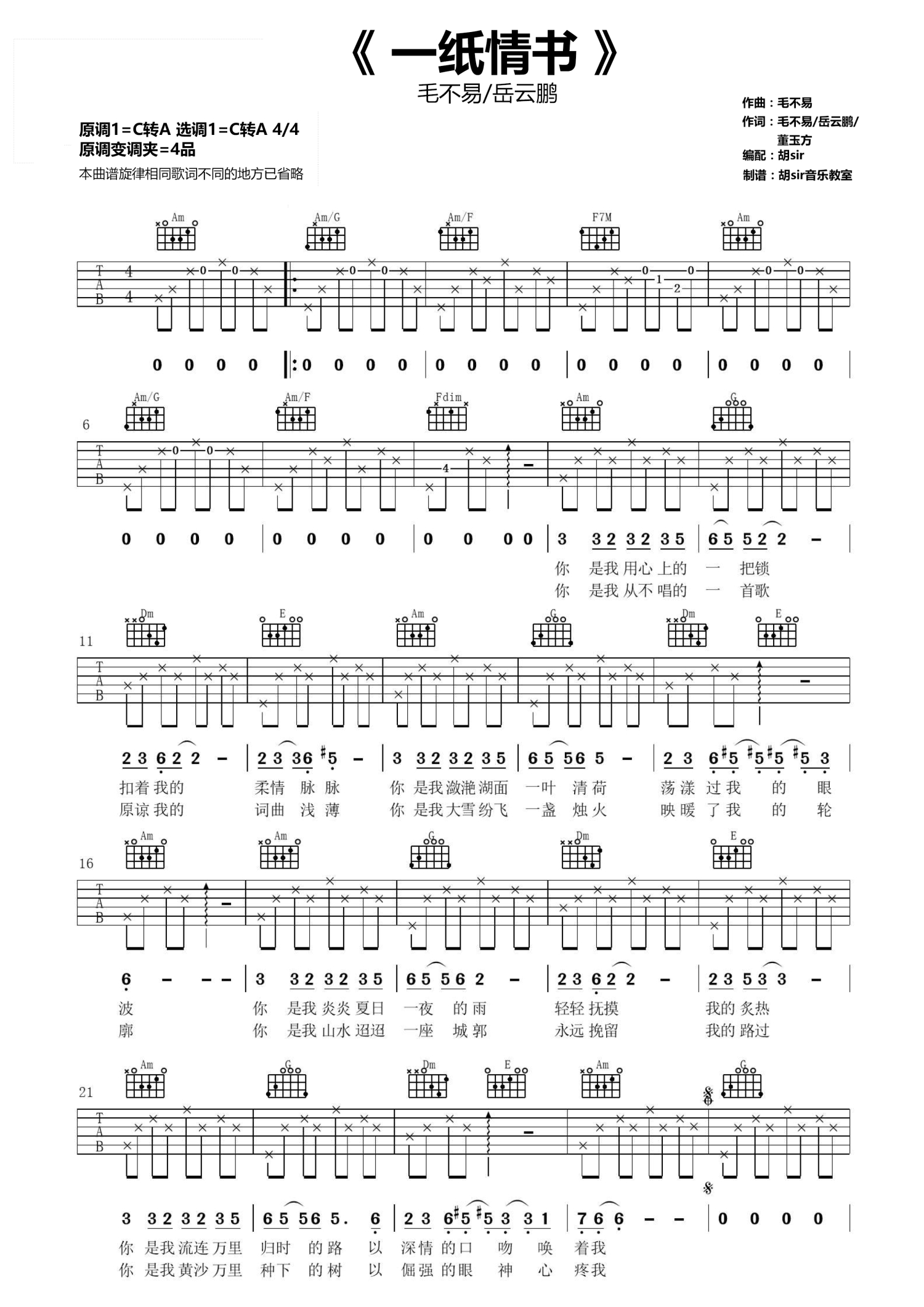 • 一纸情书吉他谱 - 毛不易岳云鹏 - C调吉他弹唱谱第1张