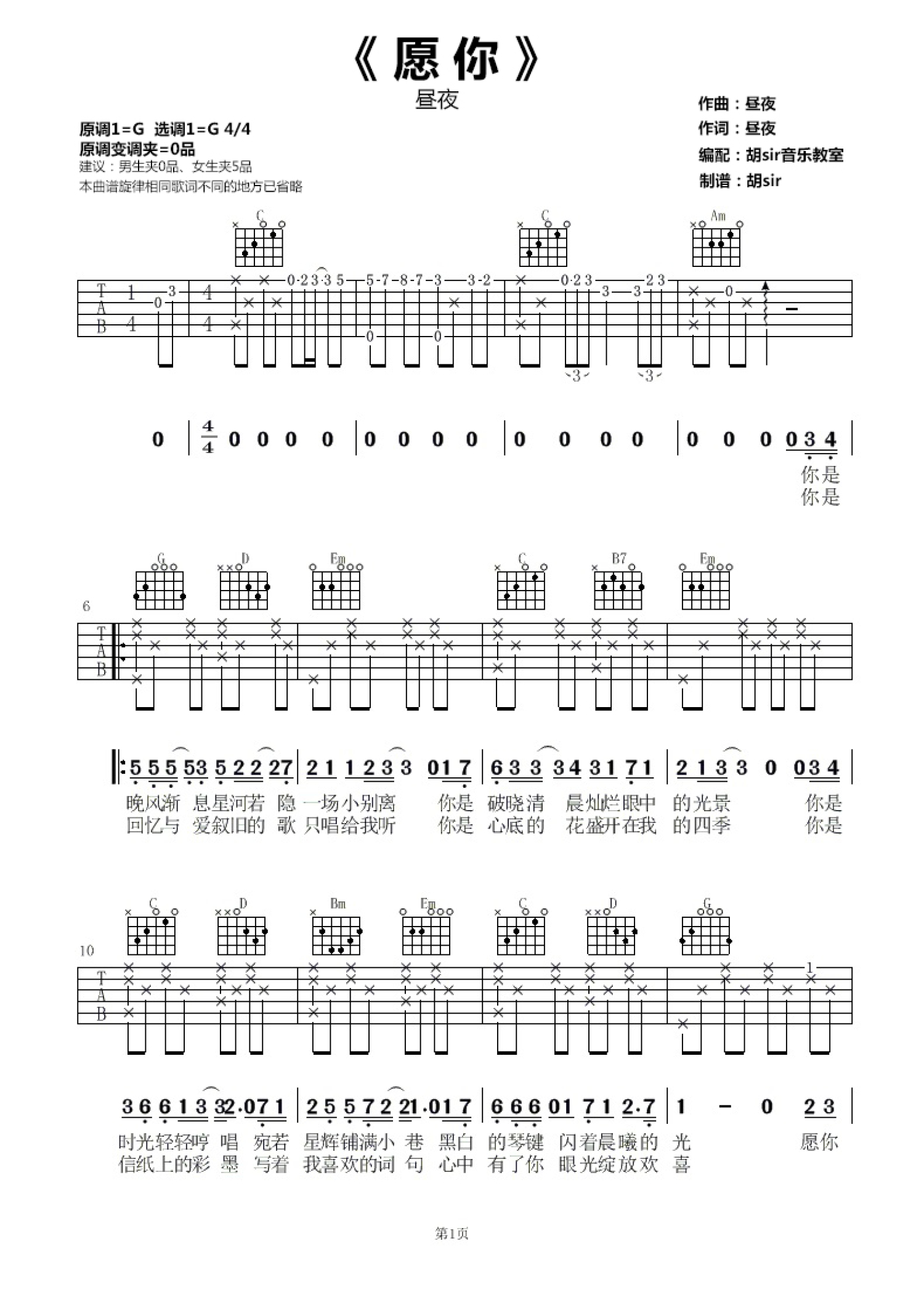 • 愿你吉他谱 - 昼夜 - G调吉他弹唱谱第1张