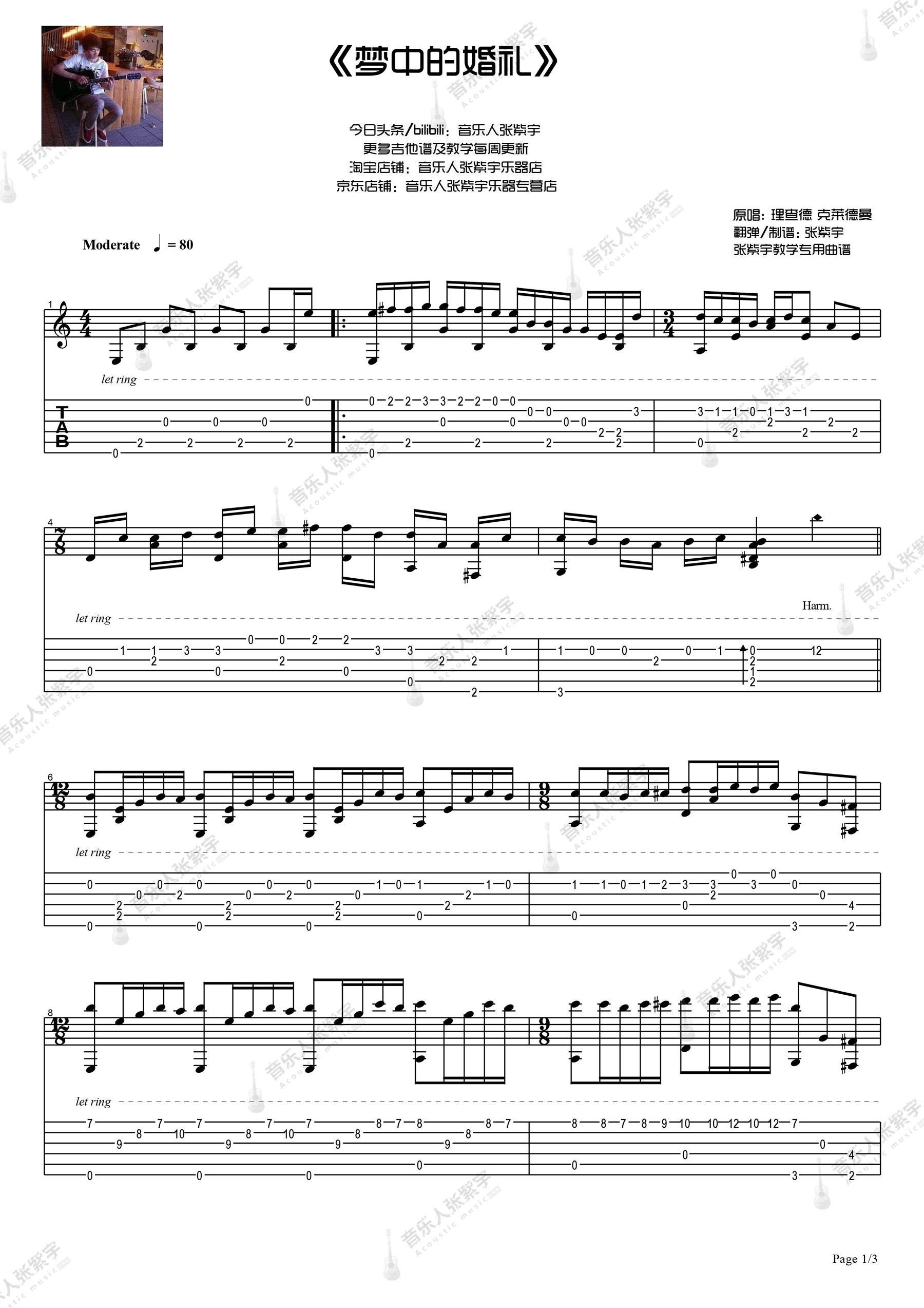 曲谱介绍: 梦中的婚礼指弹吉他谱,保罗·塞内维尔为理查德·克莱德曼量身定制的的一首曲目,张紫宇改编版本,梦中的婚礼吉他独奏谱,三张高清图片谱。 理查德·克莱德曼的《水边的阿狄丽娜》专辑中的一首经典,带有一点忧伤,吉他改编版的经常被琴友们推荐,这次分享出来教学视频。曲子标准调音,对训练左右手灵活度有不小的帮助,喜欢的琴友练起来吧~