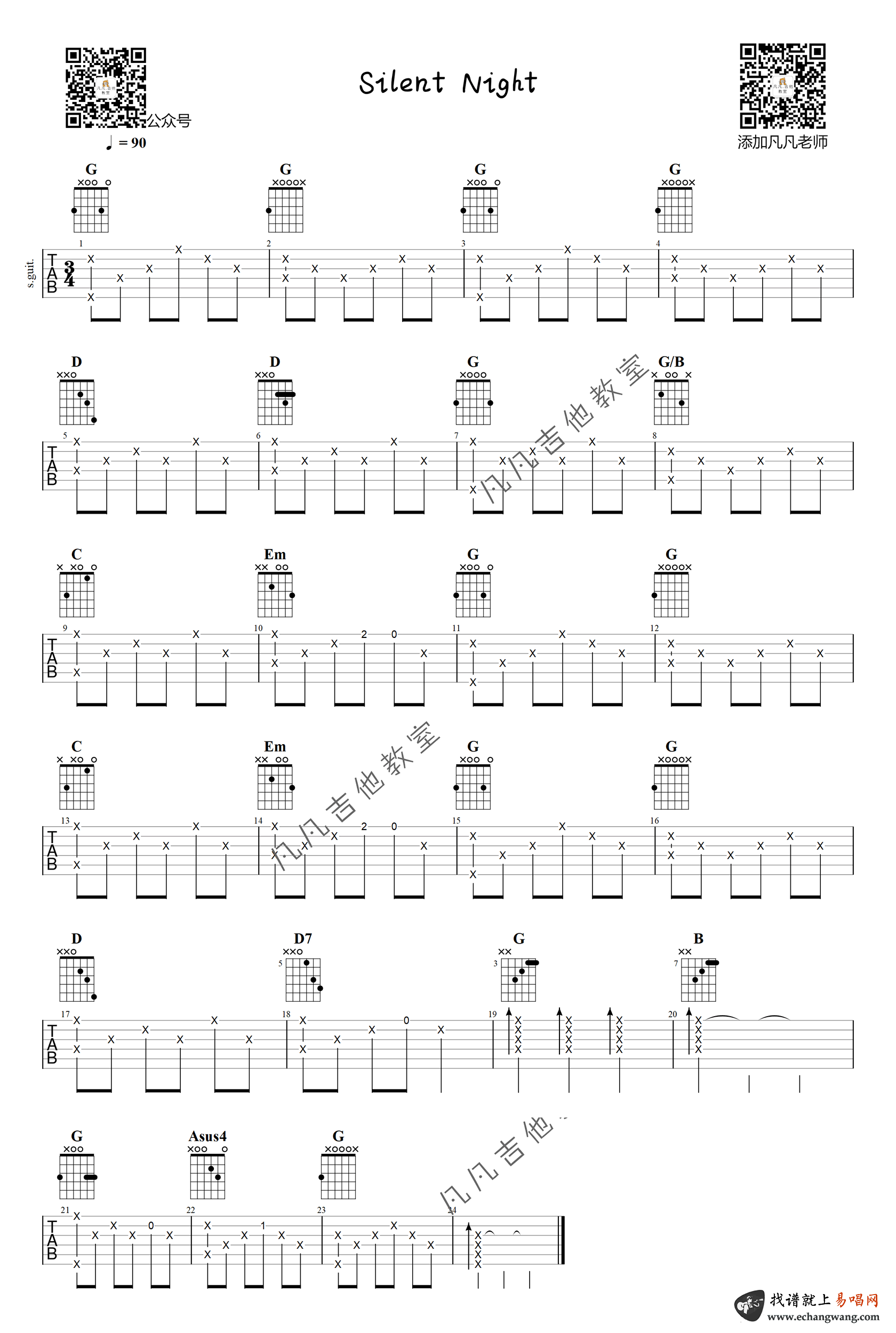 曲谱介绍: 《Silent Night》指弹吉他谱,一首经典的圣诞歌曲,每当平安夜来临,这首宁静祥和的旋律就会萦绕在我们心田,Silent Night吉他独奏谱,简单编配图片谱,凡凡吉他教室出品。 一首传统圣诞颂歌,喜欢这首曲子的琴友们,可以跟随老师带来的曲谱配套吉他演示视频学习起来,让我们在浪漫温馨的旋律中感受浓浓的爱。