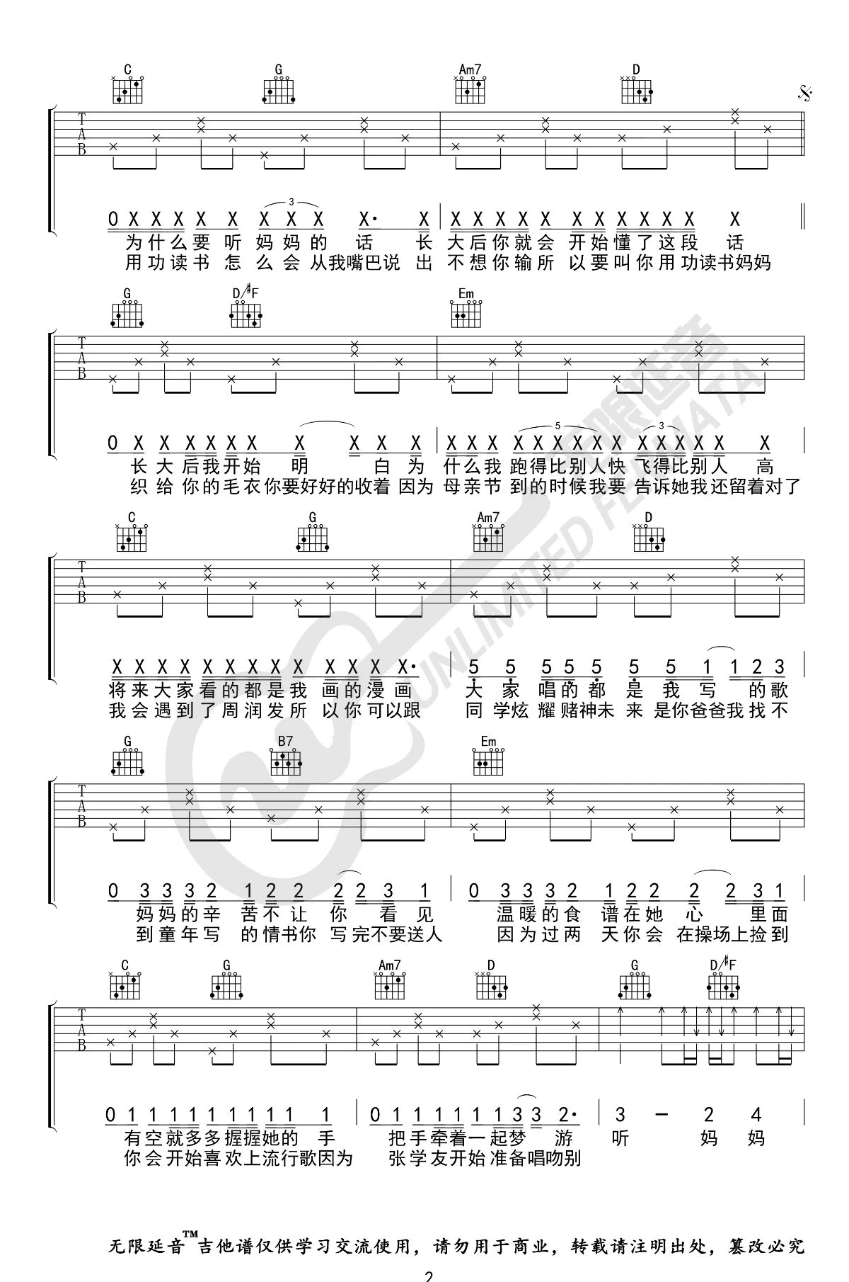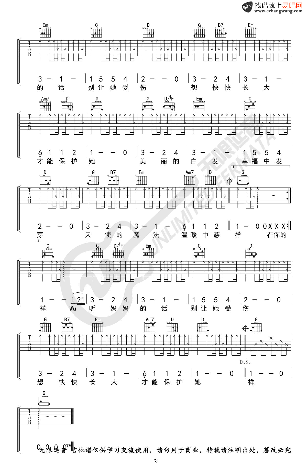 曲谱介绍: 听妈妈的话吉他谱,周杰伦演唱的一首温情又暖心的歌曲,听妈妈的话吉他六线谱,G调指法,变调夹夹三品,三张弹唱图片谱。无限延音编配出品。