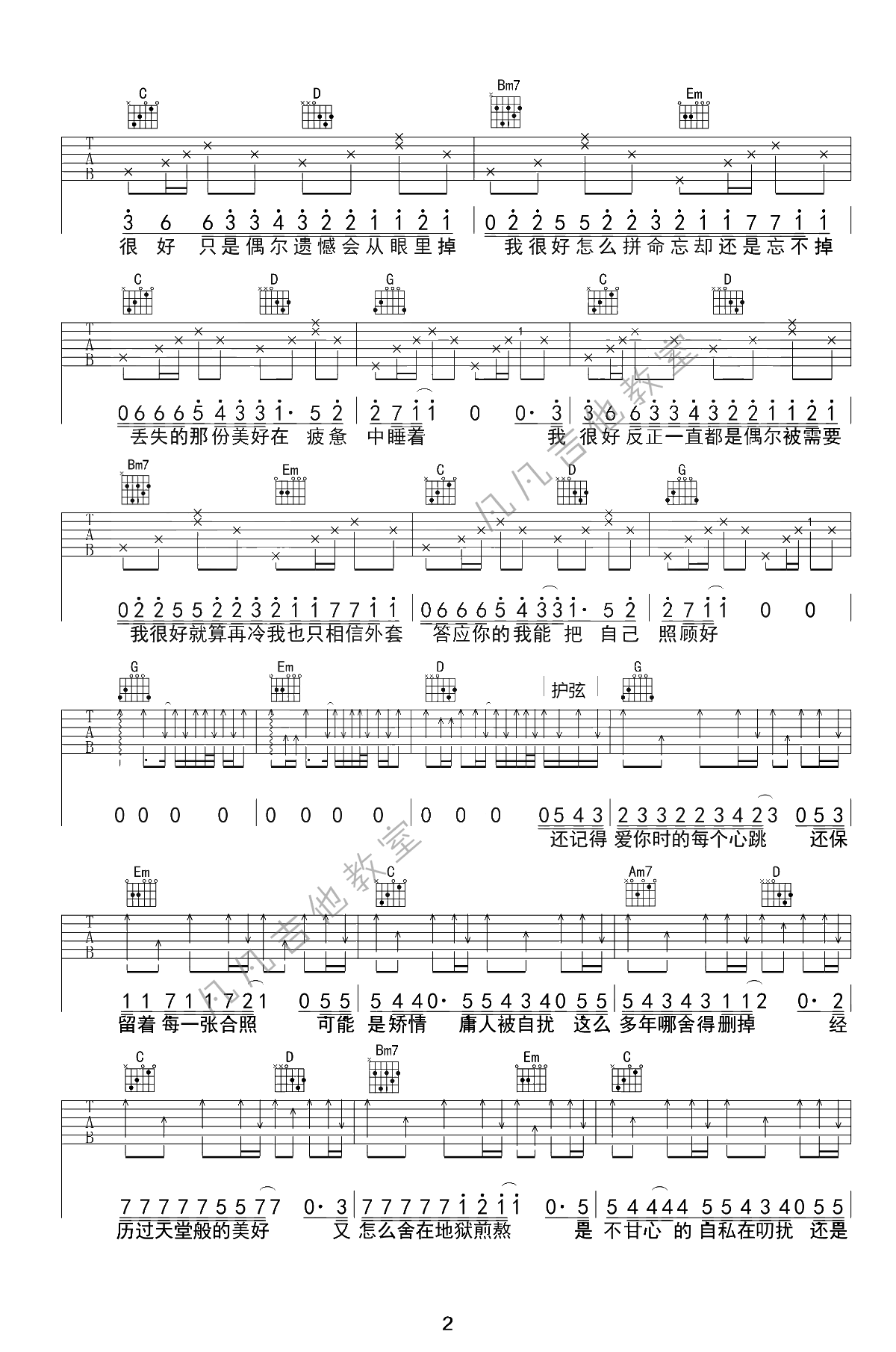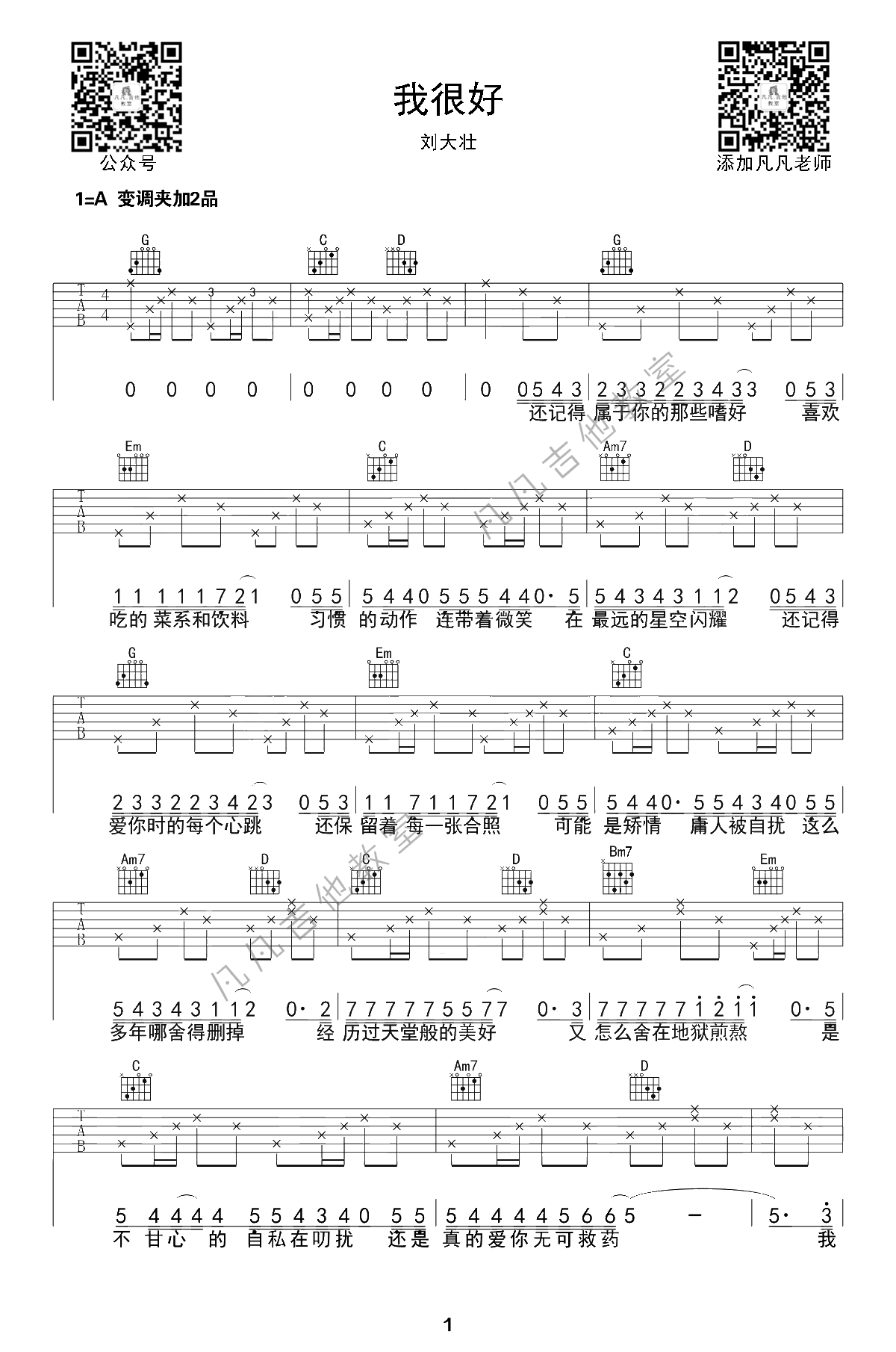 曲谱介绍: 刘大壮《我很好》吉他谱,一首好听的网络热门歌曲。我很好六线谱,原调A,选用G调指法,变调夹夹第二品,三张弹唱图片谱。凡凡吉他教室编配出品。 随谱附上吉他弹唱教学视频,琴友们可以通过老师的细致讲解,练习掌握64分音符、郝浩涵式快速扫弦方法。