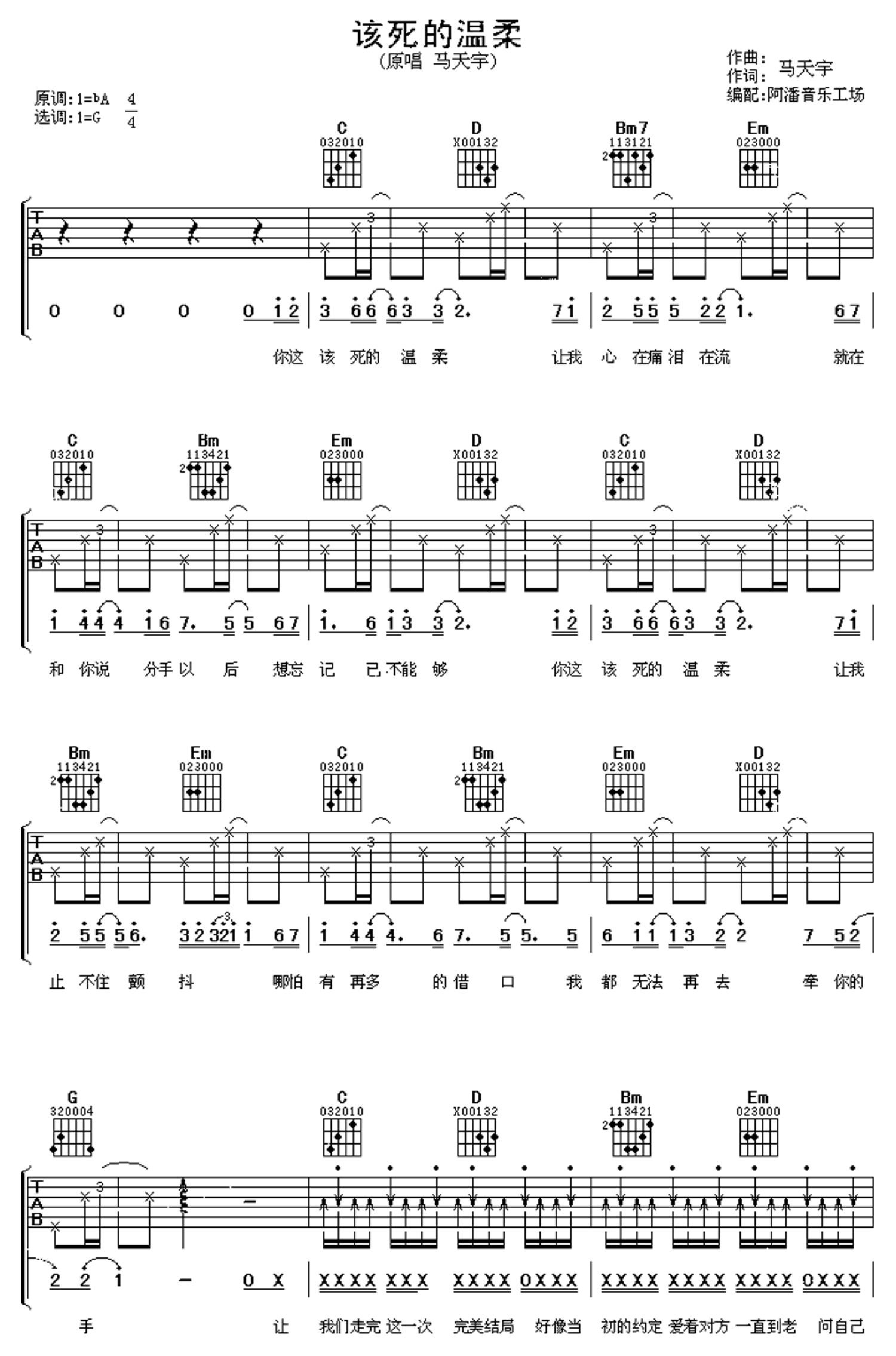该死的温柔吉他谱 - 马天宇 - G调吉他弹唱谱