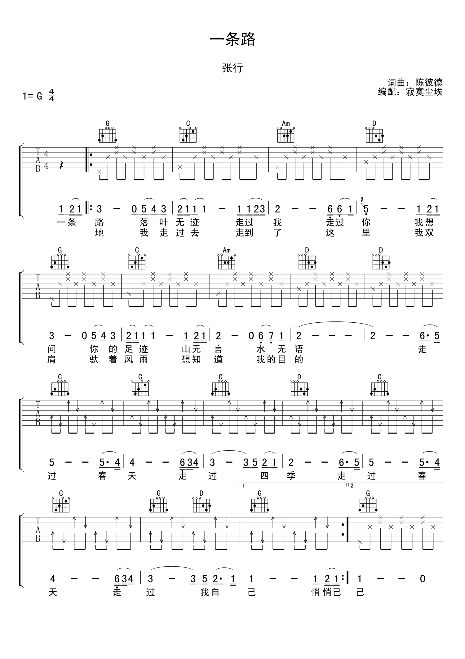 一条路吉他谱 - 张行 - G调吉他弹唱谱