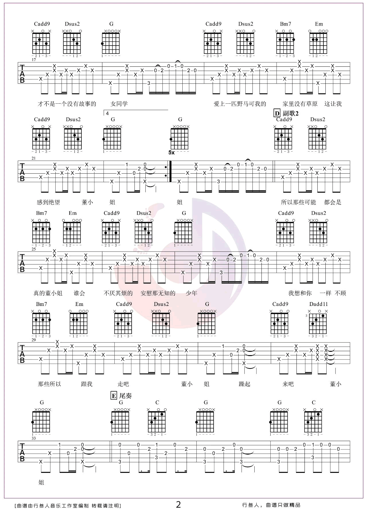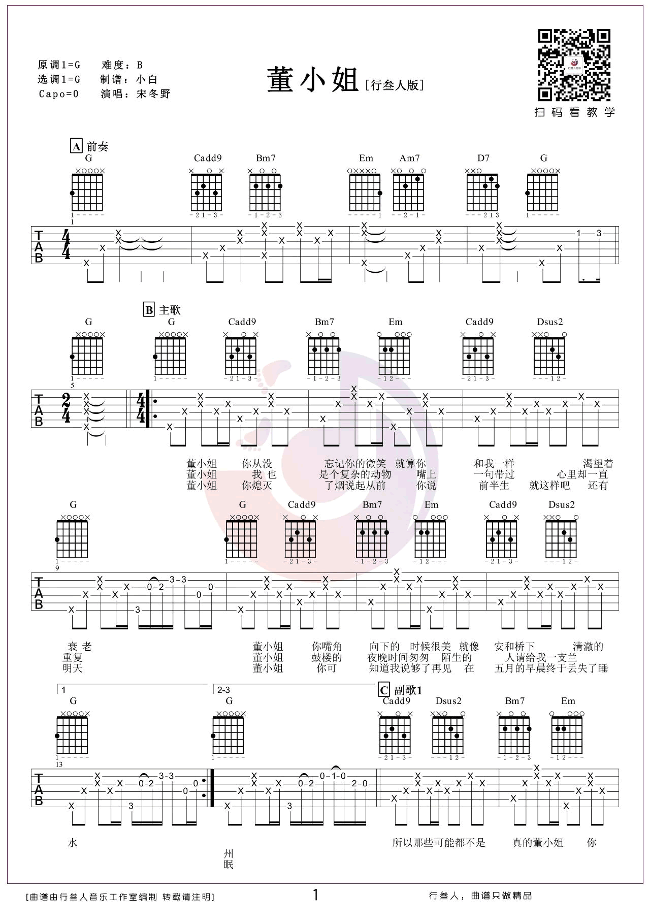 曲谱介绍: 董小姐吉他谱,宋冬野的一首代表民谣作品,董小姐六线谱,G调弹唱编配,三张图片谱例,随谱附上吉他弹唱演示视频。 你会看到很多人的微信签名, “陌生的人 请给我一支兰州” “董小姐你才不是一个没有故事的女同学” “爱上一匹野马 可我的家里没有草原” ,这首歌已然成为民谣中的经典。
