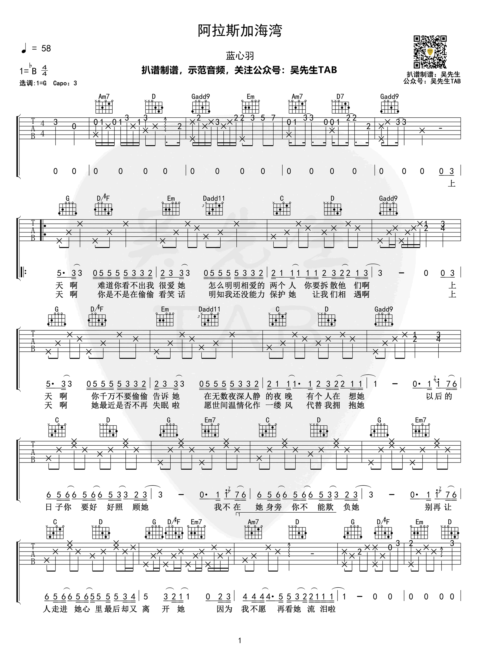 曲谱介绍: 阿拉斯加海湾吉他谱,蓝心羽海风一样温柔的歌声诉说着心事。阿拉斯加海湾六线谱,歌曲原调降B,选用G调指法编配,变调夹夹三品。
