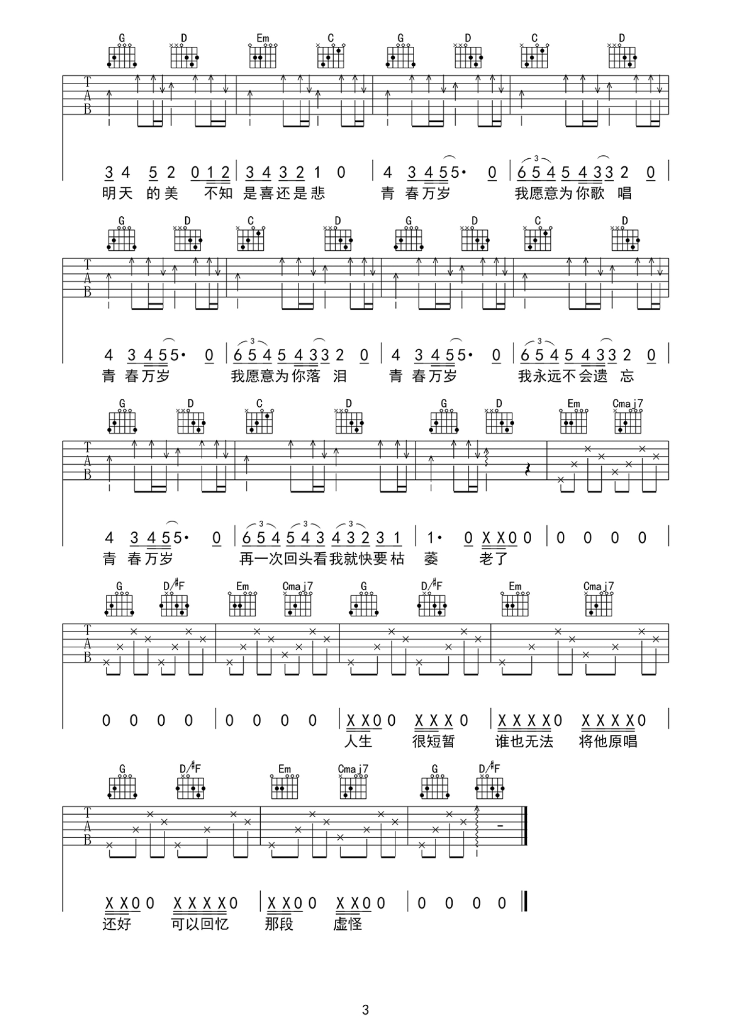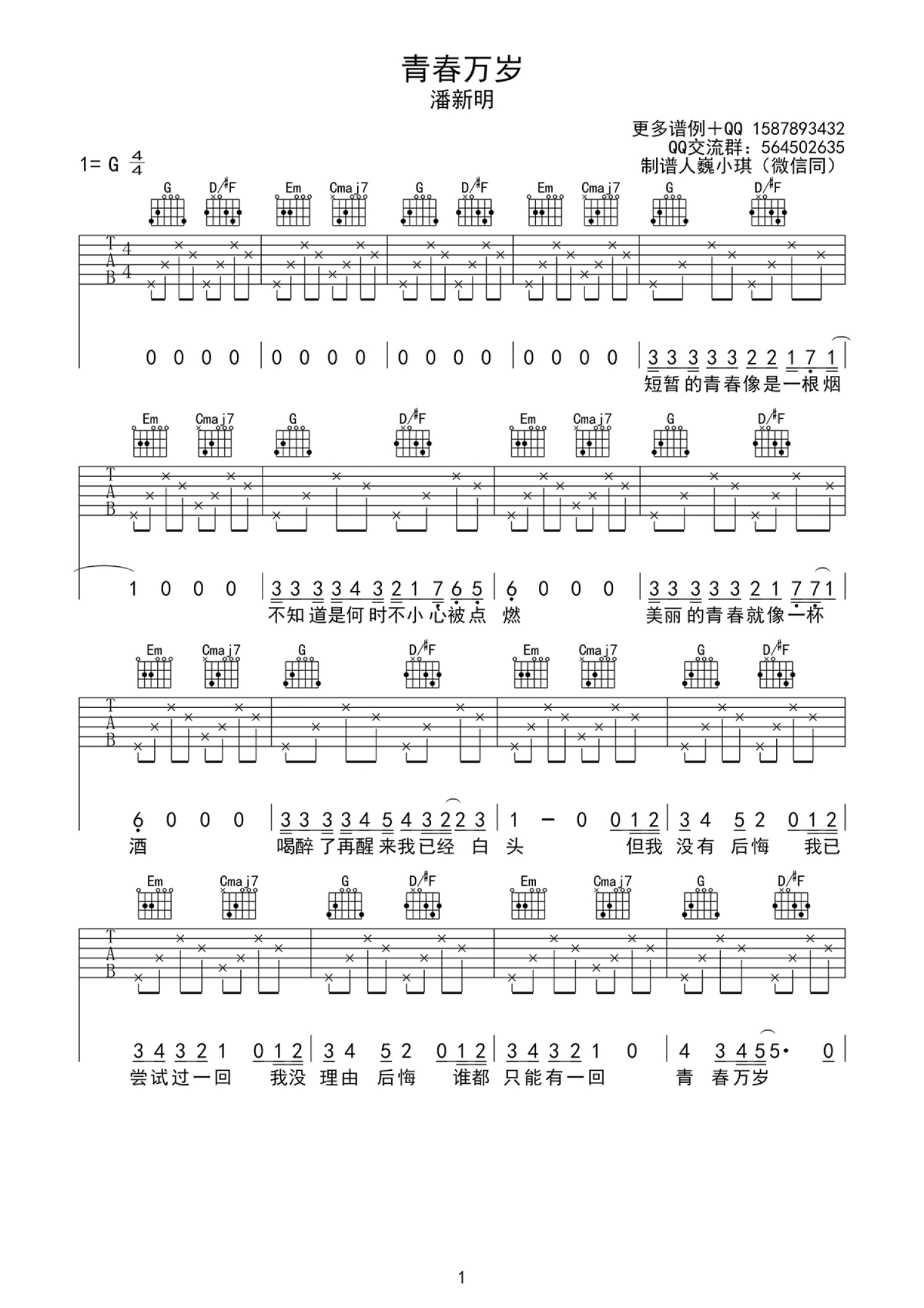 青春万岁吉他谱 - 潘新明 - G调吉他弹唱谱