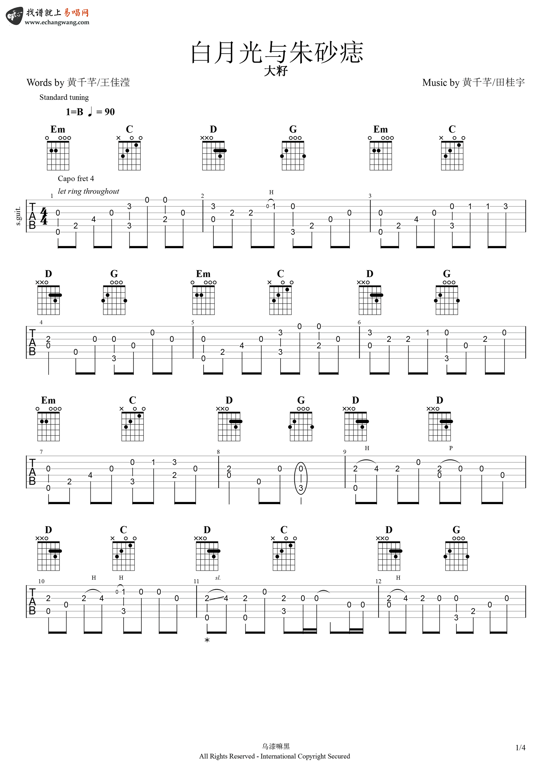 曲谱介绍: 白月光与朱砂痣指弹谱,大籽演唱的一首热门歌曲。白月光与朱砂痣吉他独奏谱,原调B,G调指法,变调夹夹4品,完整版共四张高清图片谱。