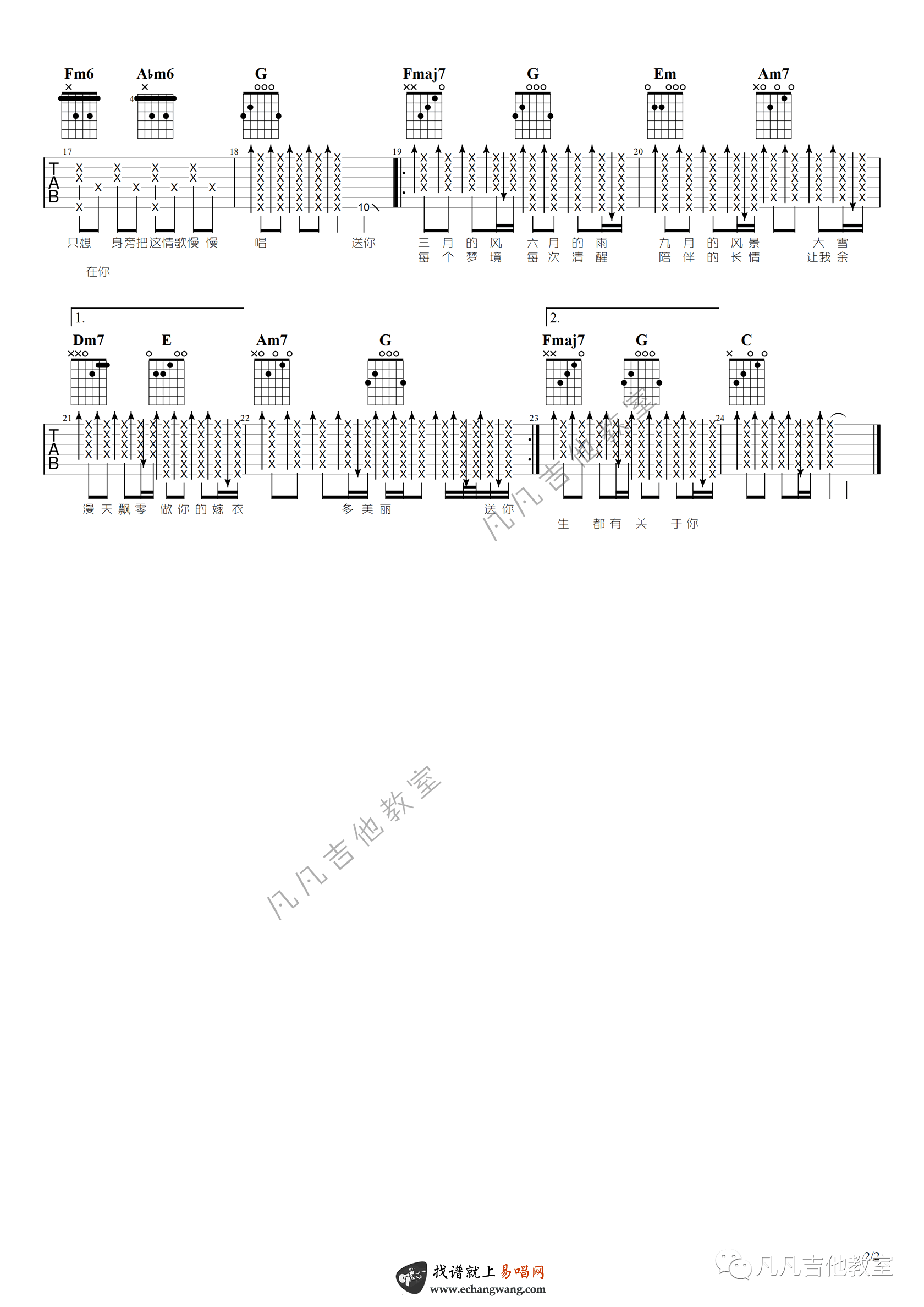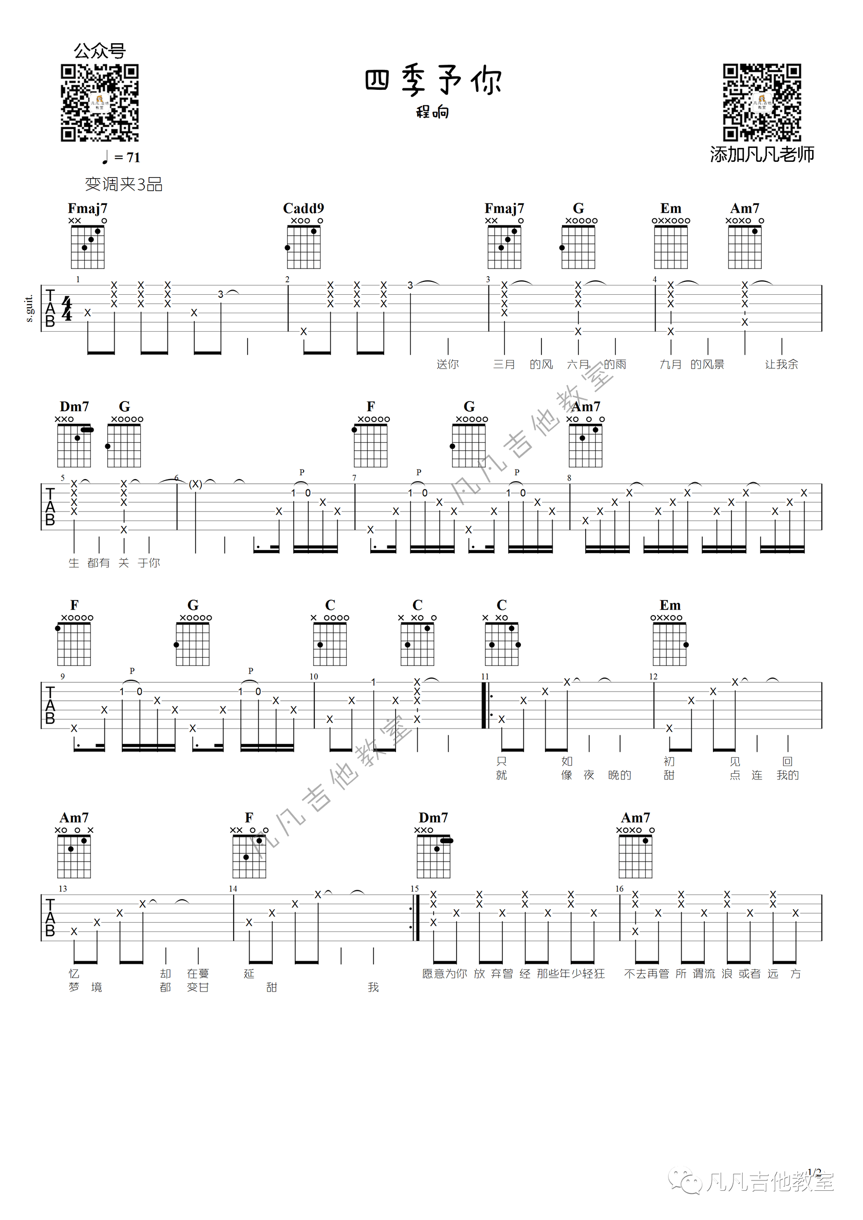 曲谱介绍: 四季予你吉他谱,程响演唱,前奏指法和弦不难,注意节奏的把控即可。难点在于G和弦32分快速扫弦。大家可以改为简单的:下下 下下上、扫弦节奏:下下 下下上,大家看着歌词,注意需要反复的地方。 一首清新温暖的治愈歌曲,唱出对于美好爱情的向往和追求。随谱附上吉他弹唱视频,感谢凡凡吉他教室出品,琴友们可以参照演示练习。