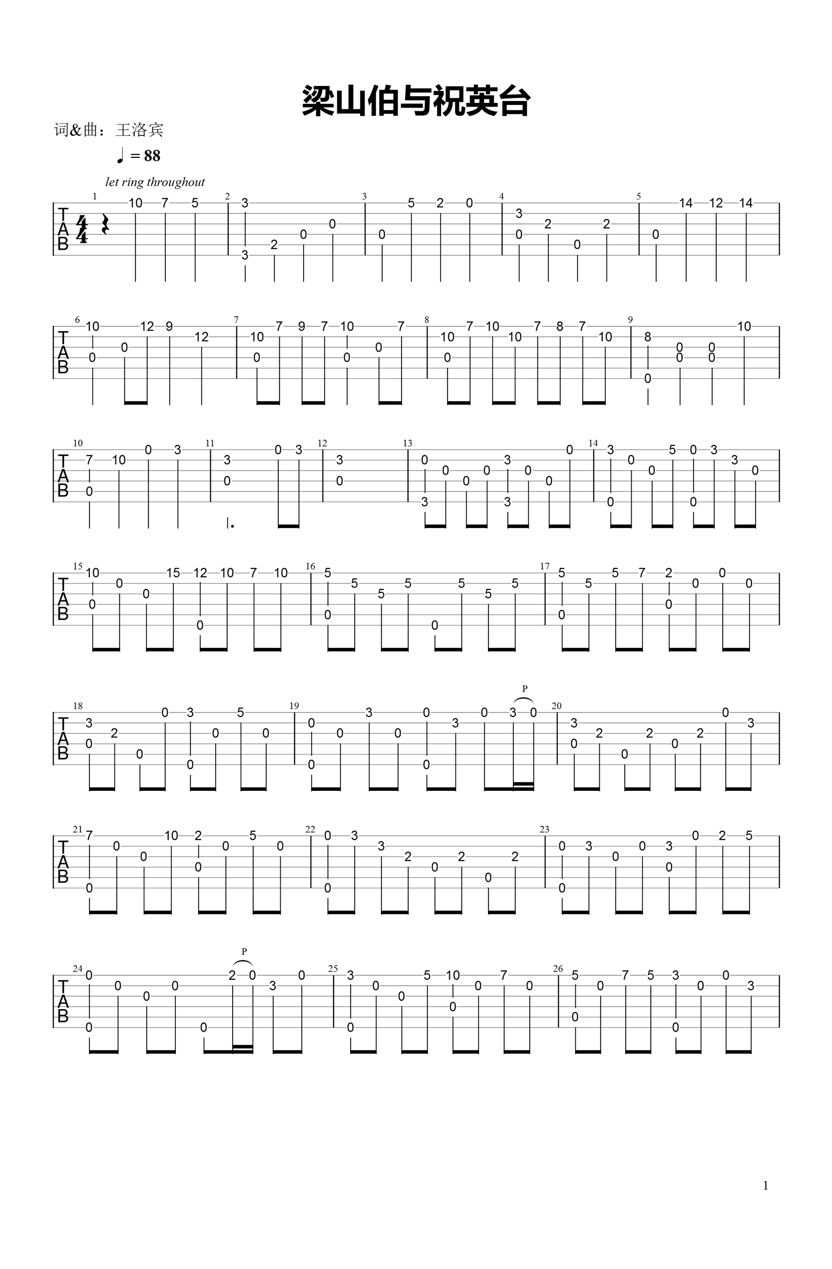 梁祝吉他谱 - 梁山伯与祝英台 - 吉他独奏谱