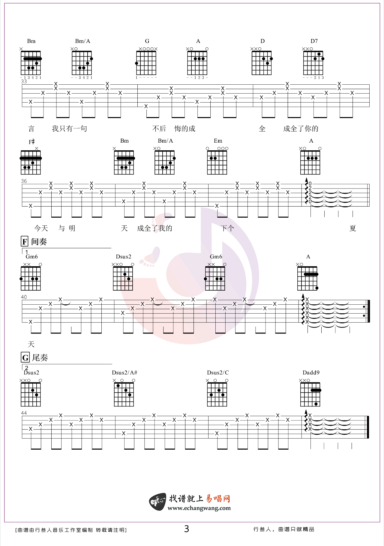 曲谱介绍: 成全吉他谱,林宥嘉翻唱版本,刘若英原唱的一首经典情歌,成全六线谱,原调#D选调D,变调夹夹一品。三张弹唱图片谱。 一首笑中带泪的城市新民谣,唱出无奈里的明亮与酸楚,一个人的成全,好过三个人的纠结。随谱附上小白老师吉他弹唱视频,琴友们可以跟随示范演示练习。