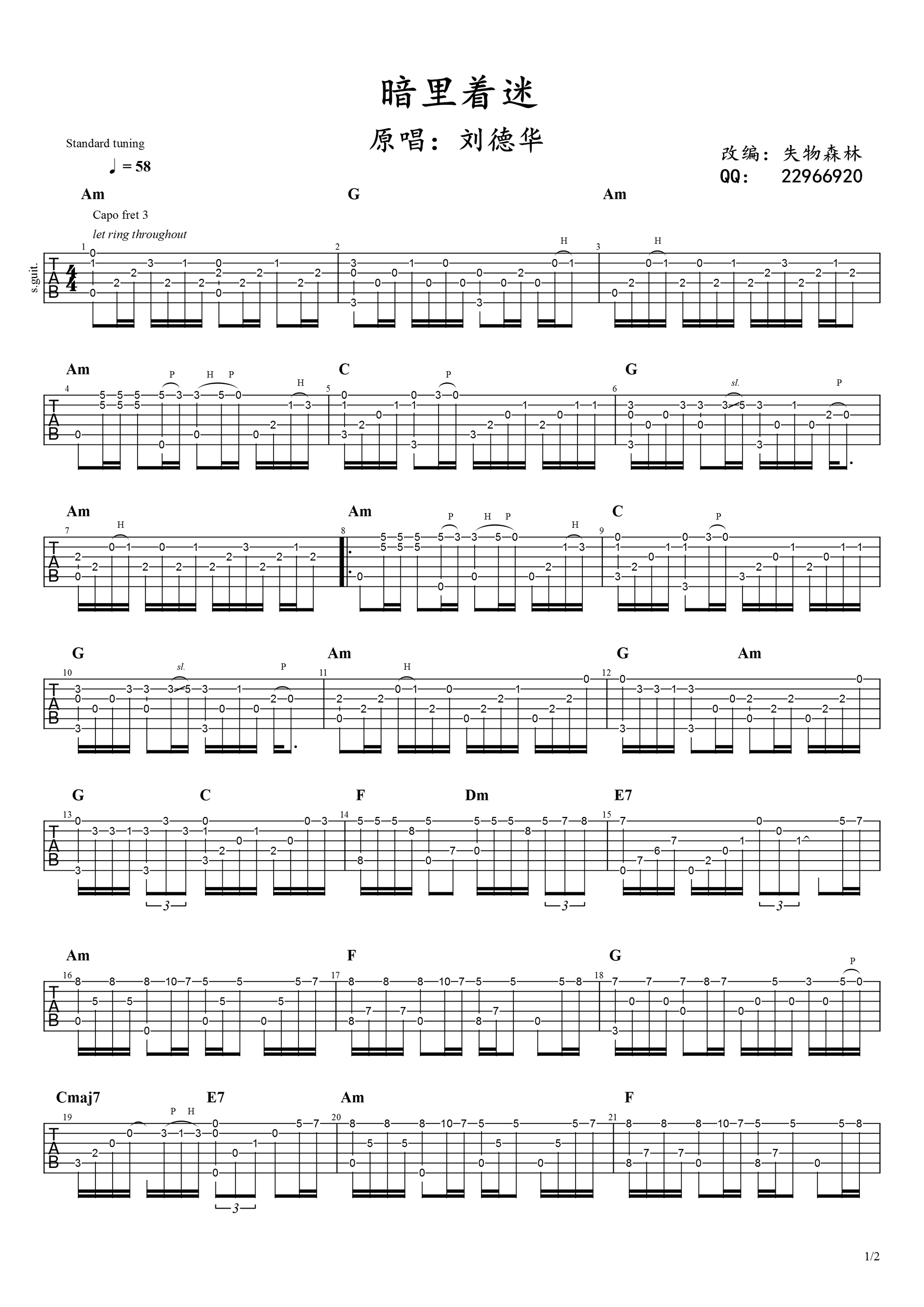 曲谱介绍: 暗里着迷指弹谱,刘德华的一首经典粤语老歌改编,暗里着迷吉他独奏谱,两张高清图片谱例。感谢失物森林老师编配分享,并为琴友们送上曲谱配套指弹演奏视频。 一首暗恋之歌,也是刘德华演唱会的保留曲目,在其很多电影中恰到好外地剧情位置作为插曲,歌声深挚诉说着掩藏在内心深处的对于爱人的眷恋和思念。