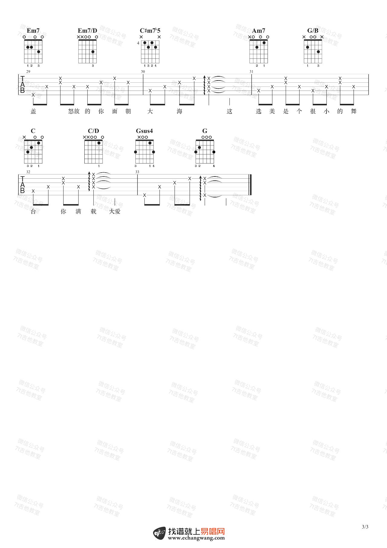 曲谱介绍: 女神吉他谱,郑欣宜演唱的一首粤语歌曲。女神吉他弹唱谱,歌曲原调是F大调,采用G大调的指法来编配,随谱附上吉他弹唱演示,视频里是标准音调弦,没有用变调夹。如果想弹原调,需要降全音调弦。 和弦分析:首先讲一下比较基本的,把一些三和弦丰富一下,二级、六级用了小七;四级用了add9;五级用了4/5……这首歌用了很多斜杠和弦的用法,大体框架类似卡农的和弦走向,并稍有变化,1 → 5/7 → 6m → 6m/5 → 4 → 1/3 → 2m → 5 可以发现低音部分是1765432的音阶下行,许多流行歌都会用这个套路,这首歌也是一个例子。「没有说谎……」还有「怒放的你面朝大海」这两句 Em7 → Em7/D → C#m7-5 ,这种升四级半减七很多首歌都有出现这个用法,必需学会呀!有几处Em7的前面用了B7/D#来过渡,这个是副属和弦的常见用法,平时在歌曲里也出现比较多,建议掌握!