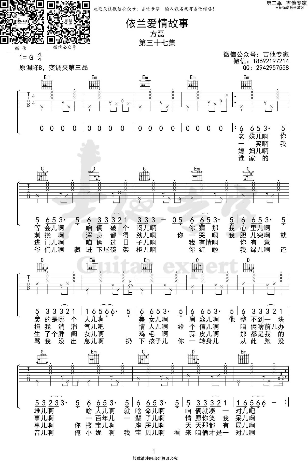曲谱介绍: 依兰爱情故事,方磊贾玲献唱电影《你好李焕英》主题曲,依兰爱情故事吉他弹唱谱,原调降B选调G,变调夹夹第三品。 这首歌曲调就很凄美的感觉、简单朴实的歌词,讲述了一个感人至深、真实无奈的故事,唱述一对恋人平凡的一生。
