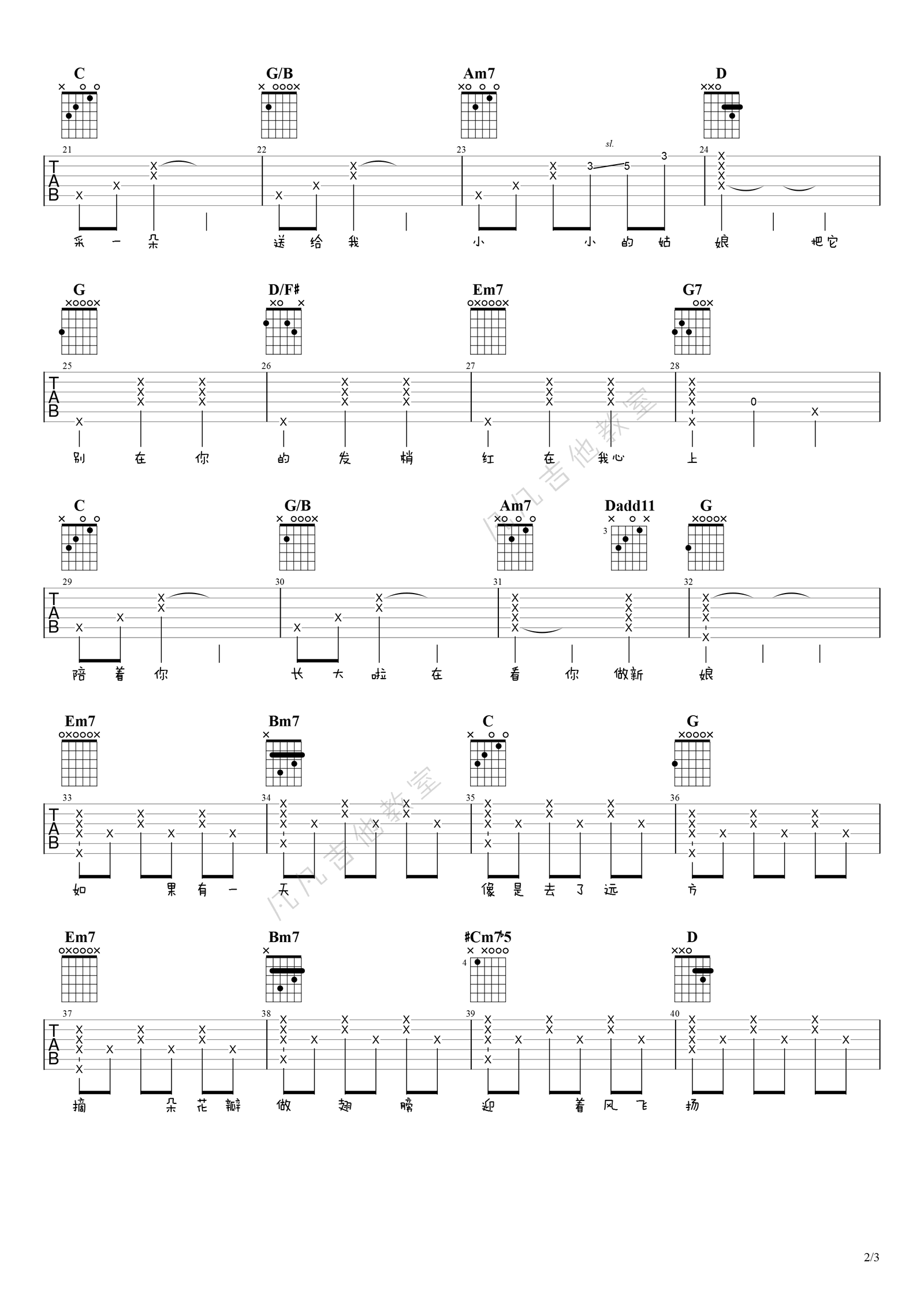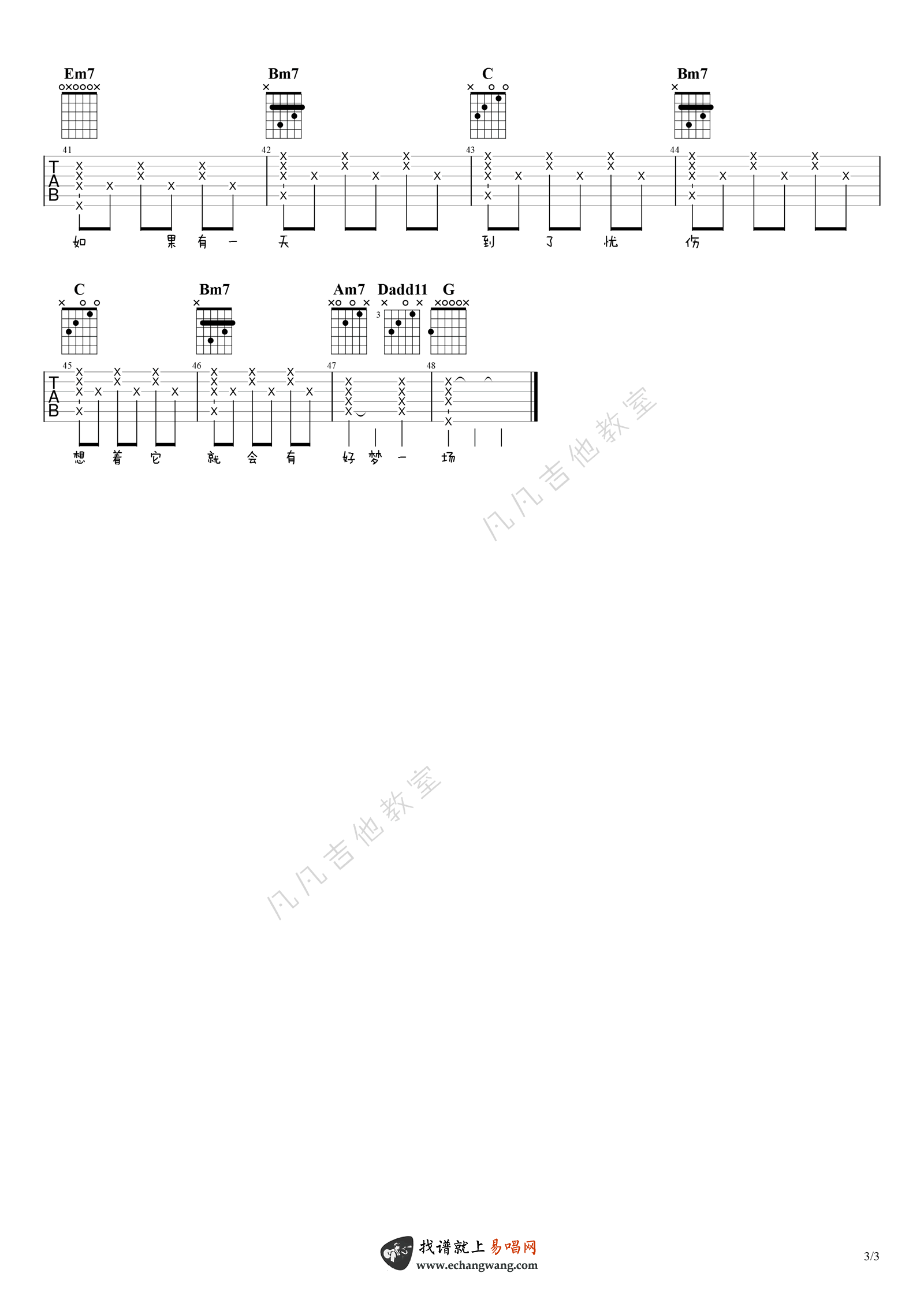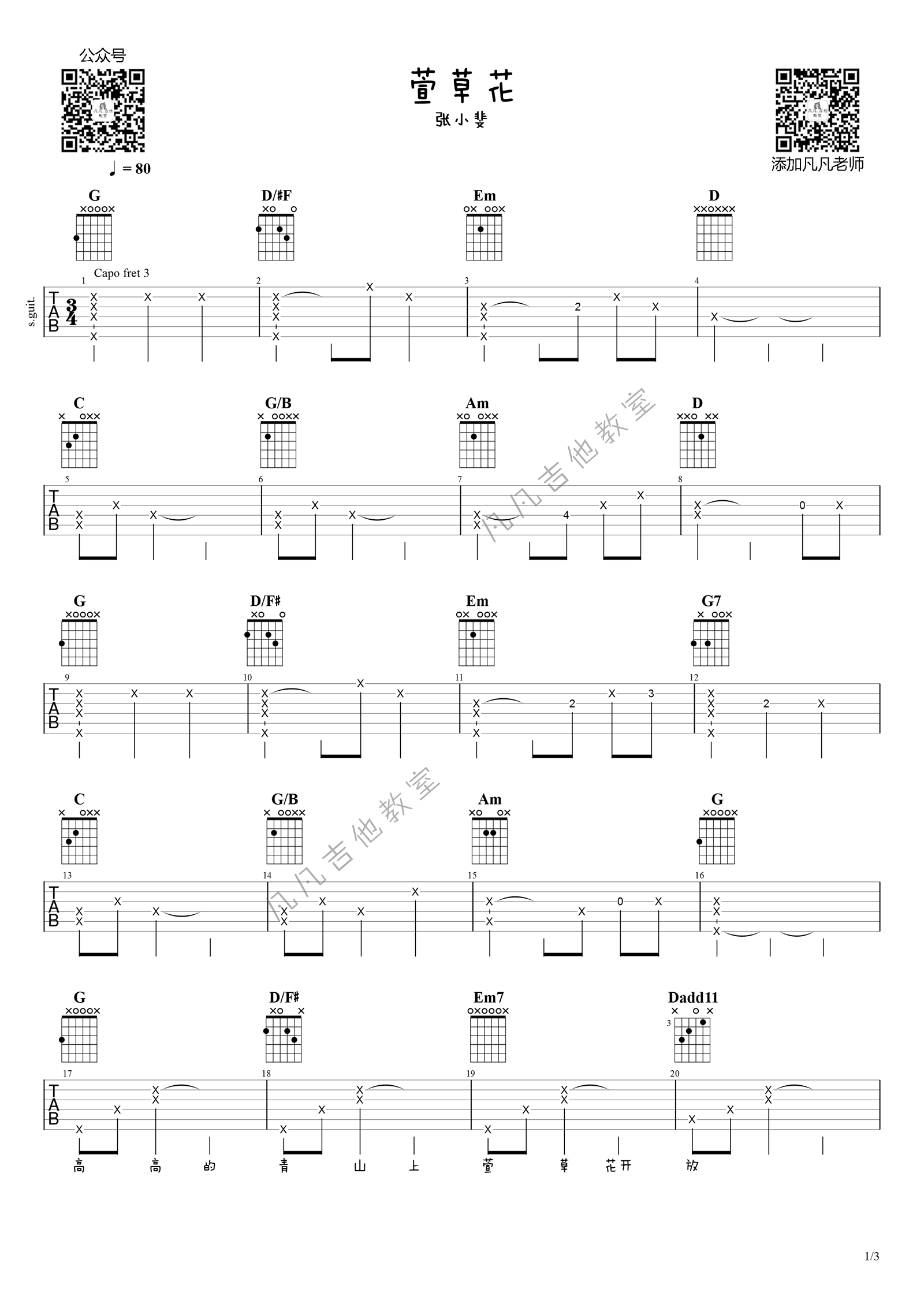 曲谱介绍: 《萱草花》吉他谱,张小斐演唱的一首歌唱母爱的歌曲,温情脉脉,感人至深。萱草花吉他弹唱谱,G调指法,变调夹夹三品,三张图片六线谱。感谢凡凡吉他教室出品。 热映电影《你好,李焕英》插曲,谱子没有人工泛音,稍有简化。数字表示品。和弦除了Bm7其余的很简单。随谱附上配套吉他弹唱视频,琴友们参照视频演示练习。