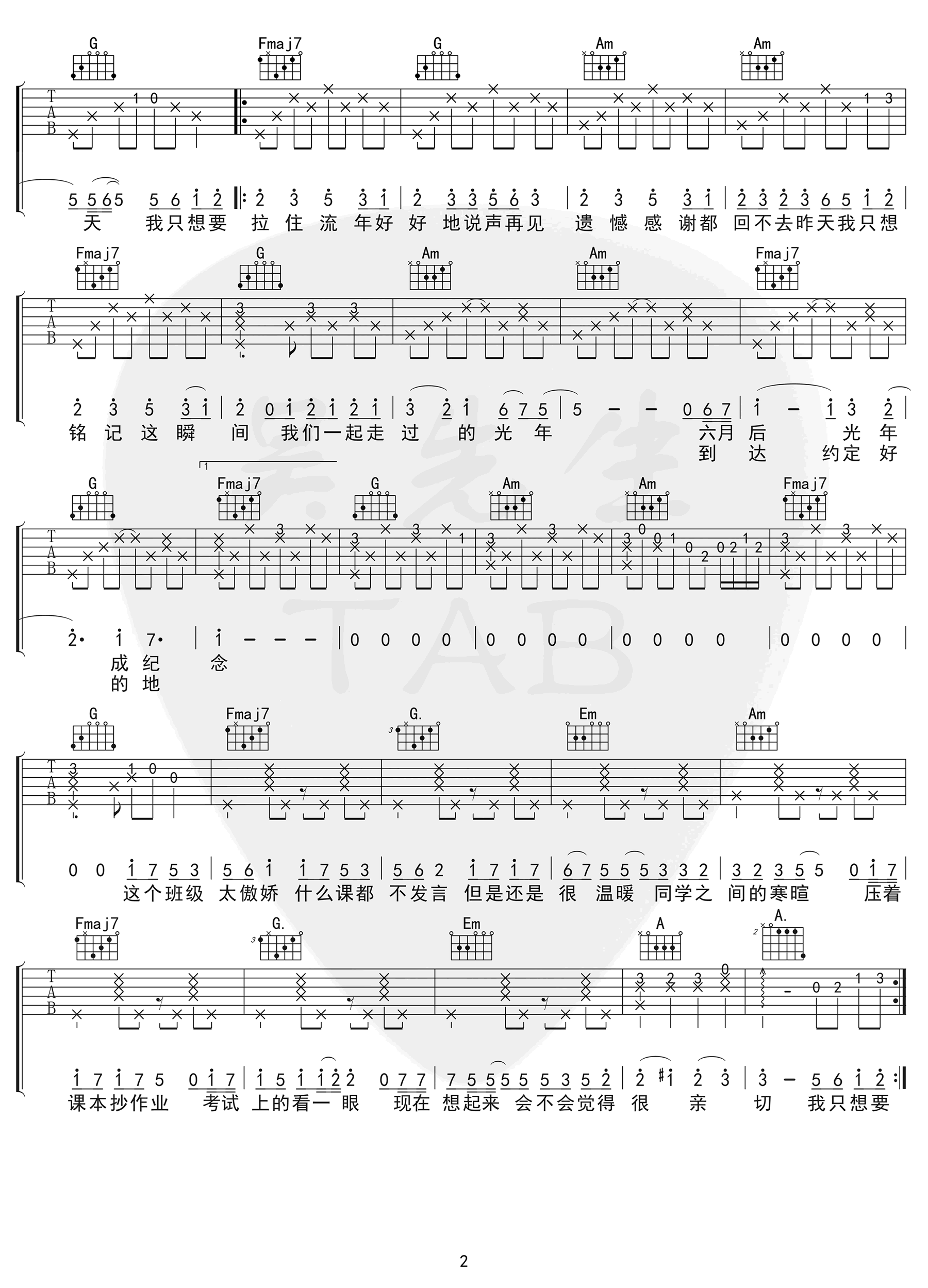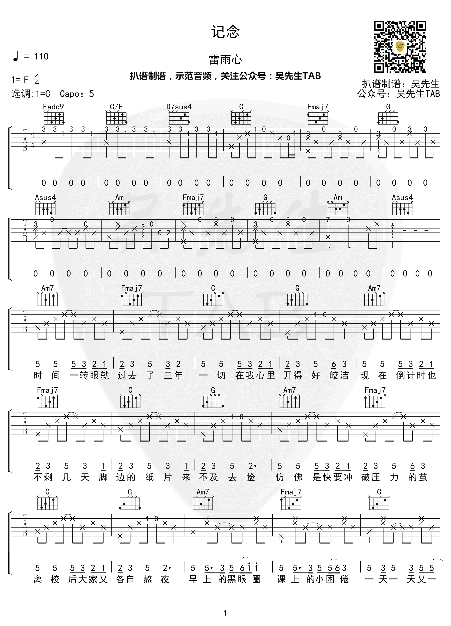 曲谱介绍: 《记念》吉他谱,雷雨心《中国好歌曲》原创的一首毕业季歌曲,记念六线谱,原调F,选调C,变调夹夹第五品。吴先生编配出品分享,琴谱网网更新上传。