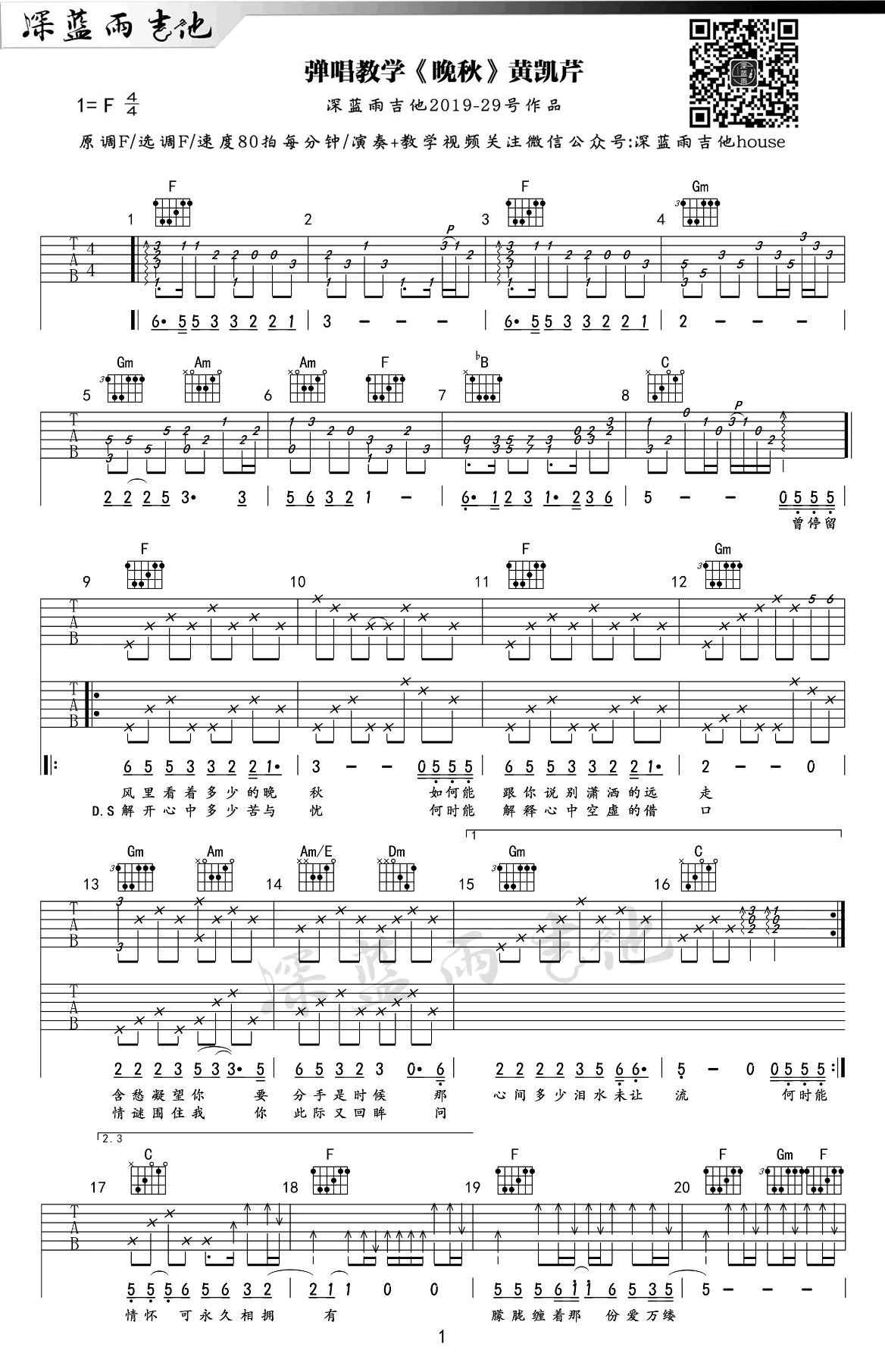 曲谱介绍: 黄凯芹《晚秋》吉他谱,F调指法编配,金曲重温,天凉加衣,一首经典的粤语歌曲,晚秋六线谱,深蓝雨吉他编配出品,琴谱网网更新上传。随谱附上《晚秋》吉他弹唱教学视频,琴友们跟随老师的弹唱示范讲解练习起来,琴谱网网上传分享。