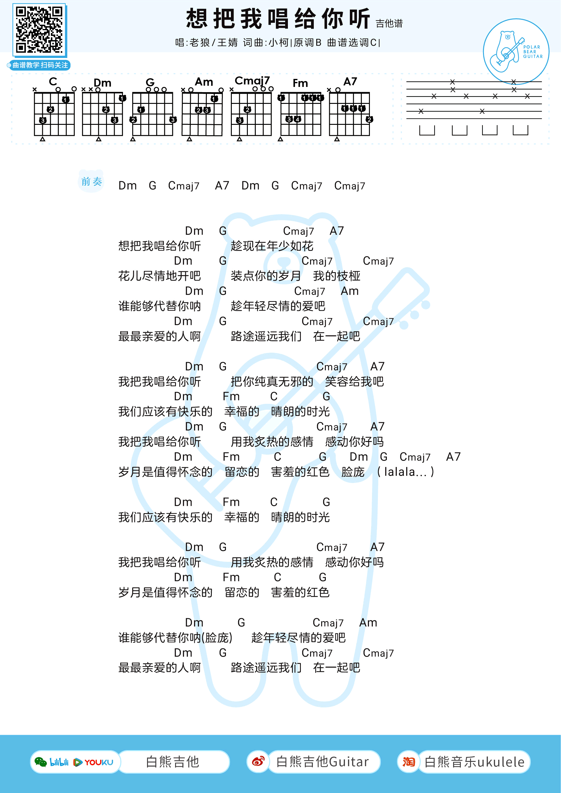 曲谱介绍: 《想把我唱给你听》吉他谱,老狼和王婧演唱的男女对唱一首校园民谣歌曲,想把我唱给你听吉他弹唱+尤克里里谱,原调B,选用C调指法,是否选择降半音调弦同学们根据自己音域选择,白熊音乐编配出品,91吉他谱整理上传。 一首散发着浓浓校园民谣曲风的歌曲,洋溢着纯真浪漫的青春气息,承载了我们对校园的美好回忆。简简单单、干干净净,一字一句唱进了我们的心里。