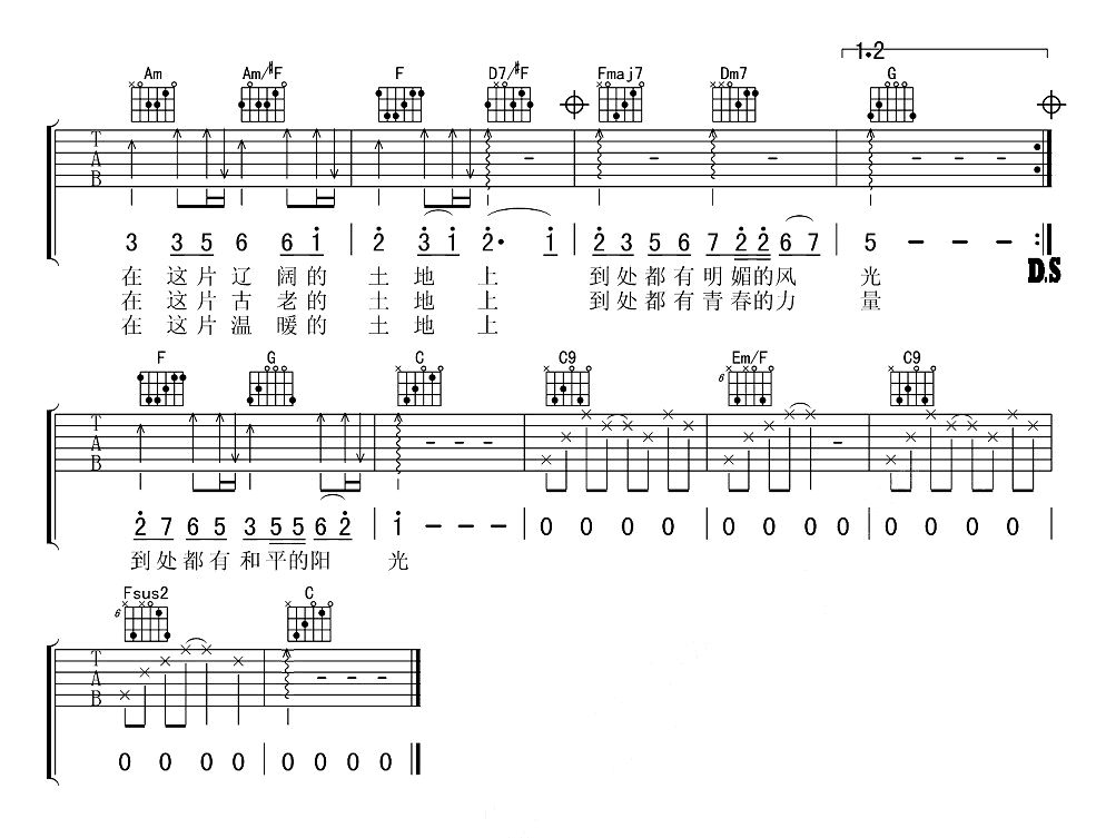 曲谱介绍: 《我的祖国》吉他谱,郭兰英演唱的一首经典爱国主义歌曲,也是老电影《上甘岭》的主题歌,我的祖国六线谱,原调F,选用C调,变调夹夹五品。感谢许榕编配分享,91吉他谱更新上传。 歌曲充满了浓浓的家国情怀。这是英雄的祖国,是我们生长的地方。这首歌唱出了祖国的强大,唱出了对家乡的眷恋,唱出了和平的阳光。这情怀就是普通生活里不灭的烟火,是夜深人静时仍然绽放的光芒。