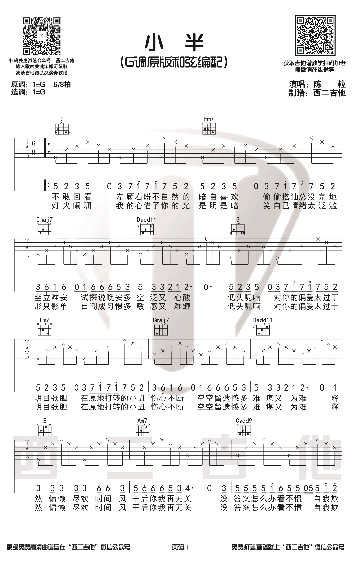 曲谱介绍: 《小半》吉他谱,陈粒演唱的一首代表民谣歌曲,唱出恋爱中主动的一方,低到尘埃里的对即将到来的爱情一种幻想和不安的情绪。小半六线谱,G调原版和弦编配,完整版共四张图片谱。西二吉他编配出品,91吉他谱更新分享。 吉他谱采用G调和弦编配,需要注意的是这首歌是6/8拍的节奏,需要多加练习才能稳定的演奏出来,边弹边唱还是有一点点难度的,下面来看一下火山老师的演奏视频吧!