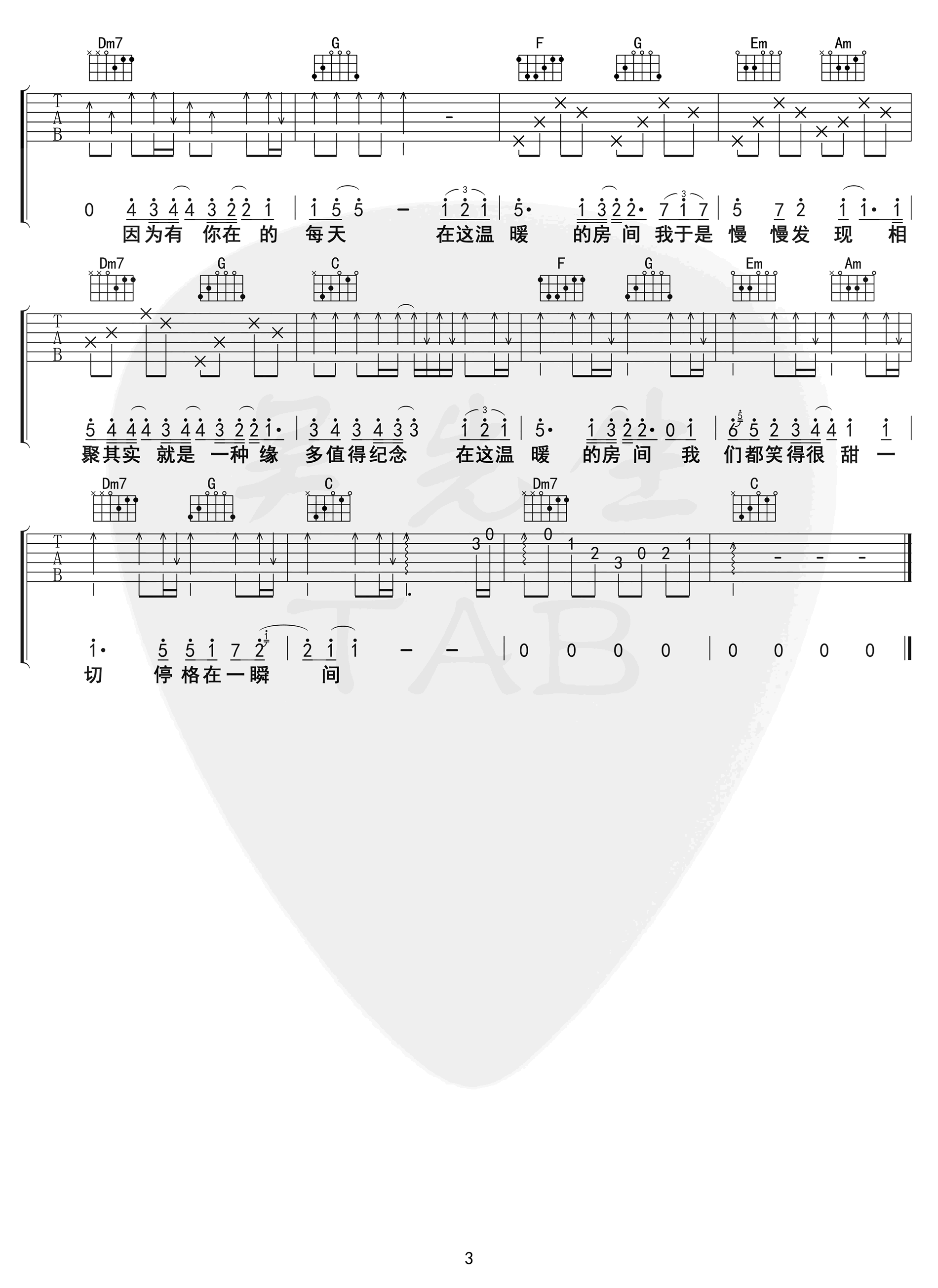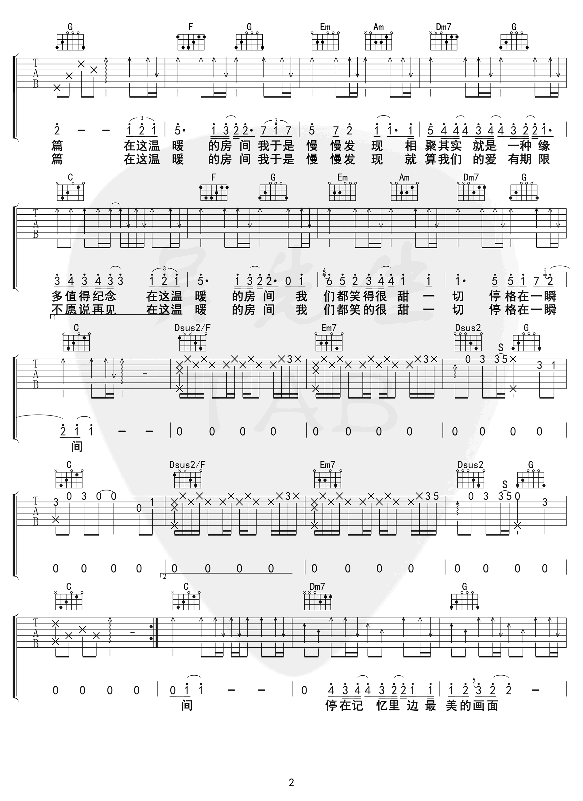 曲谱介绍: 刘瑞琦《房间》吉他谱,原调D,选调C,变调夹夹第二品。房间六线谱,新版作为电影《超时空同居》主题曲,歌词略有不同。谱子扒的是旧版,但是也加上了歌词,分为上下两行(上面是旧版,下面是新版)。旧版D调,变调夹夹2品,新版降E调,变调夹夹3品。吴先生编配出品,琴谱网网整理上传。