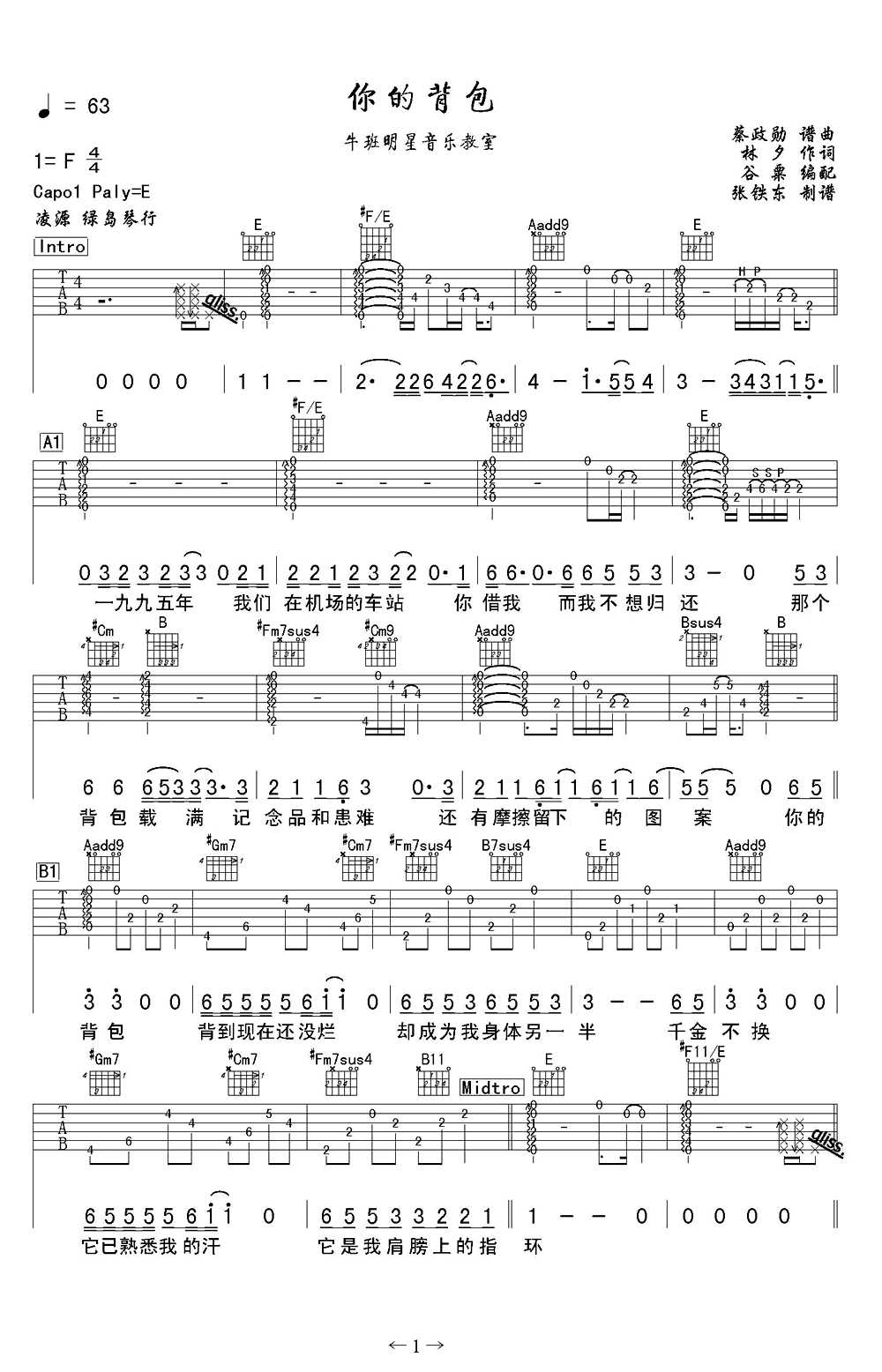 曲谱介绍:     《你的背包》吉他谱,附吉他弹唱教学示范讲解,原调Fcopa夹一品选用E调指法,你的背包吉他六线谱,图片谱感谢绿岛琴行谷粟老师编配张铁东制谱。