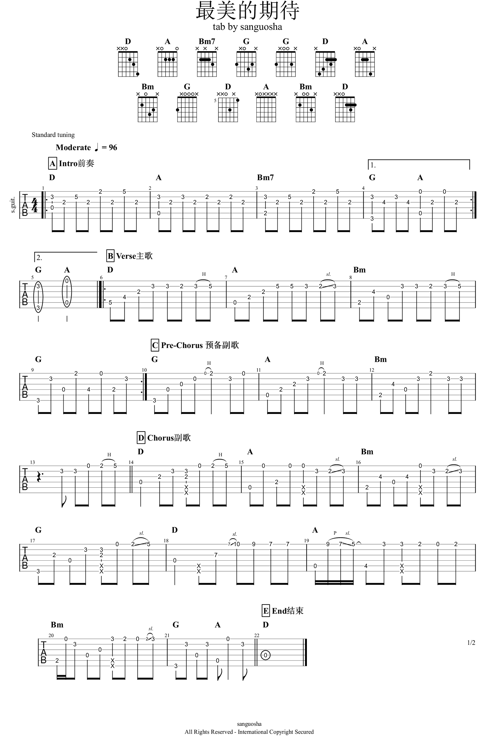 曲谱介绍: 最美的期待指弹谱,周笔畅演唱的一首代表歌曲,最美的期待吉他独奏谱,高清图片谱,sanguosha编配制谱,琴谱网网更新分享。 一首充满阳光和力量的励志情歌,最美的期待,就是不断的努力,然后在不远的前方遇见想要的我和你。世界那么大,人生那么长,为了你,我愿意成为最好的自己。 ​