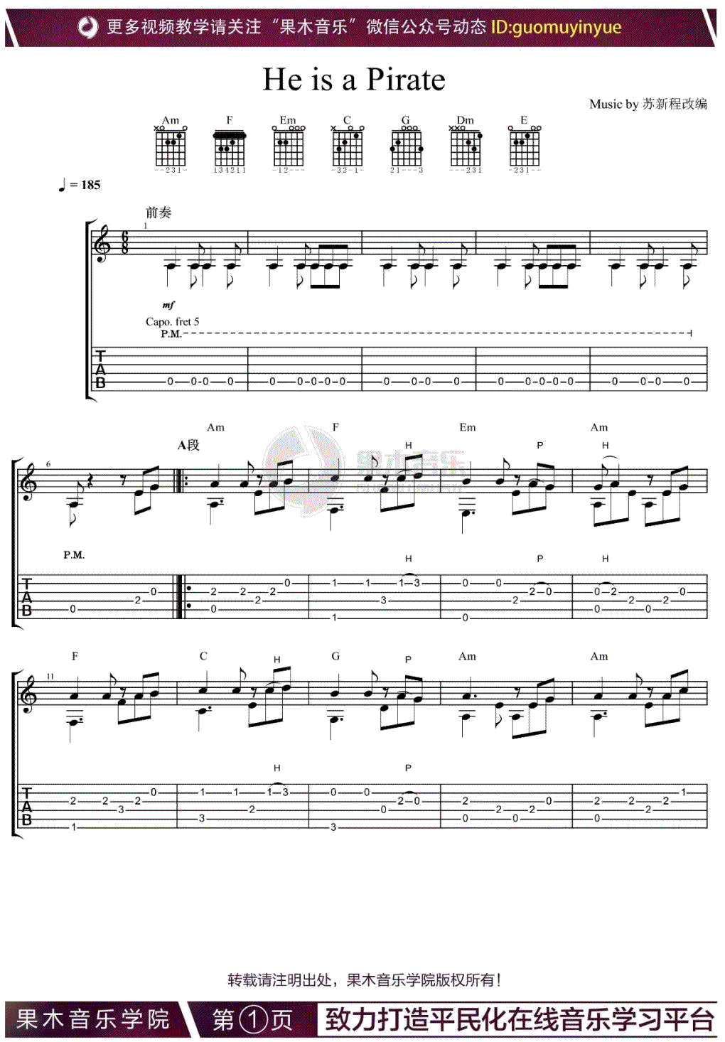 曲谱介绍: 加勒比海盗指弹谱,同名电影《加勒比海盗》主题曲,He is a pirates吉他独奏谱,完整版共四张图片谱,感谢果木音乐苏新程改编,随谱附上配套指弹吉他教学视频,91吉他谱上传更新。 加勒比海盗的主题音乐随电影推出之后十几年来经久不衰。一直被各种乐器、乐队改编演奏。主题音乐He is a pirates是最受欢迎的旋律之一。乐曲随着主和弦铿锵有力地敲击,表现船长一往无前的特质。主旋律鲜明而富有号召力,简单直白但极具气势的的和声奏出勇往直前的气势。乐曲中间段落有一段典型的爱尔兰风笛舞曲的旋律,其灵巧的装饰音风格将整个音乐画面点缀得更加华丽多彩。