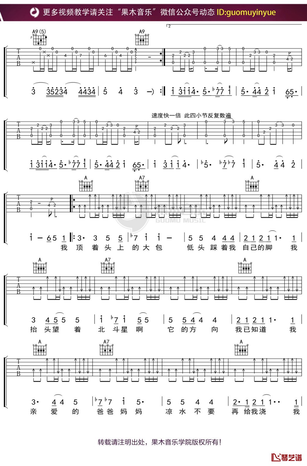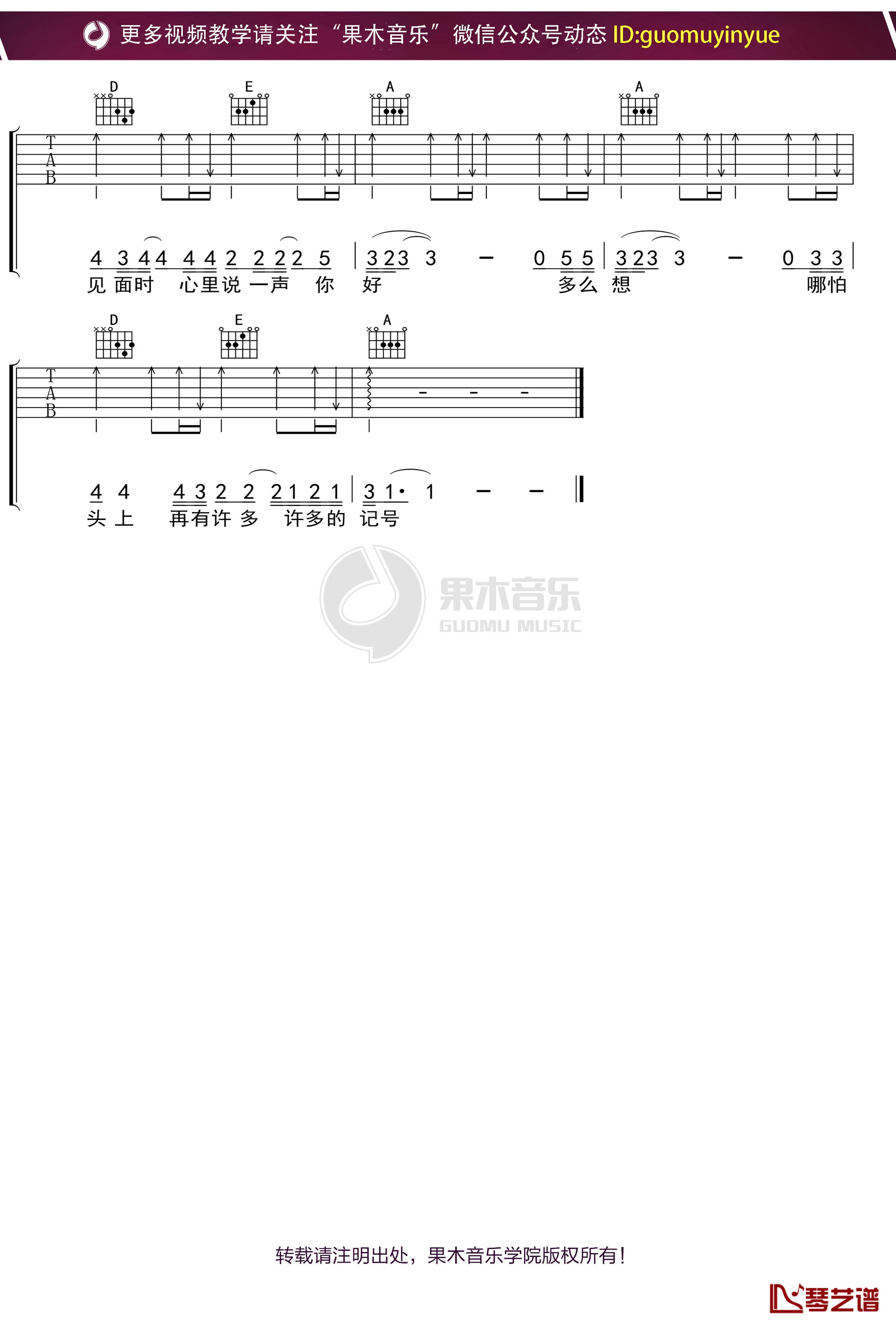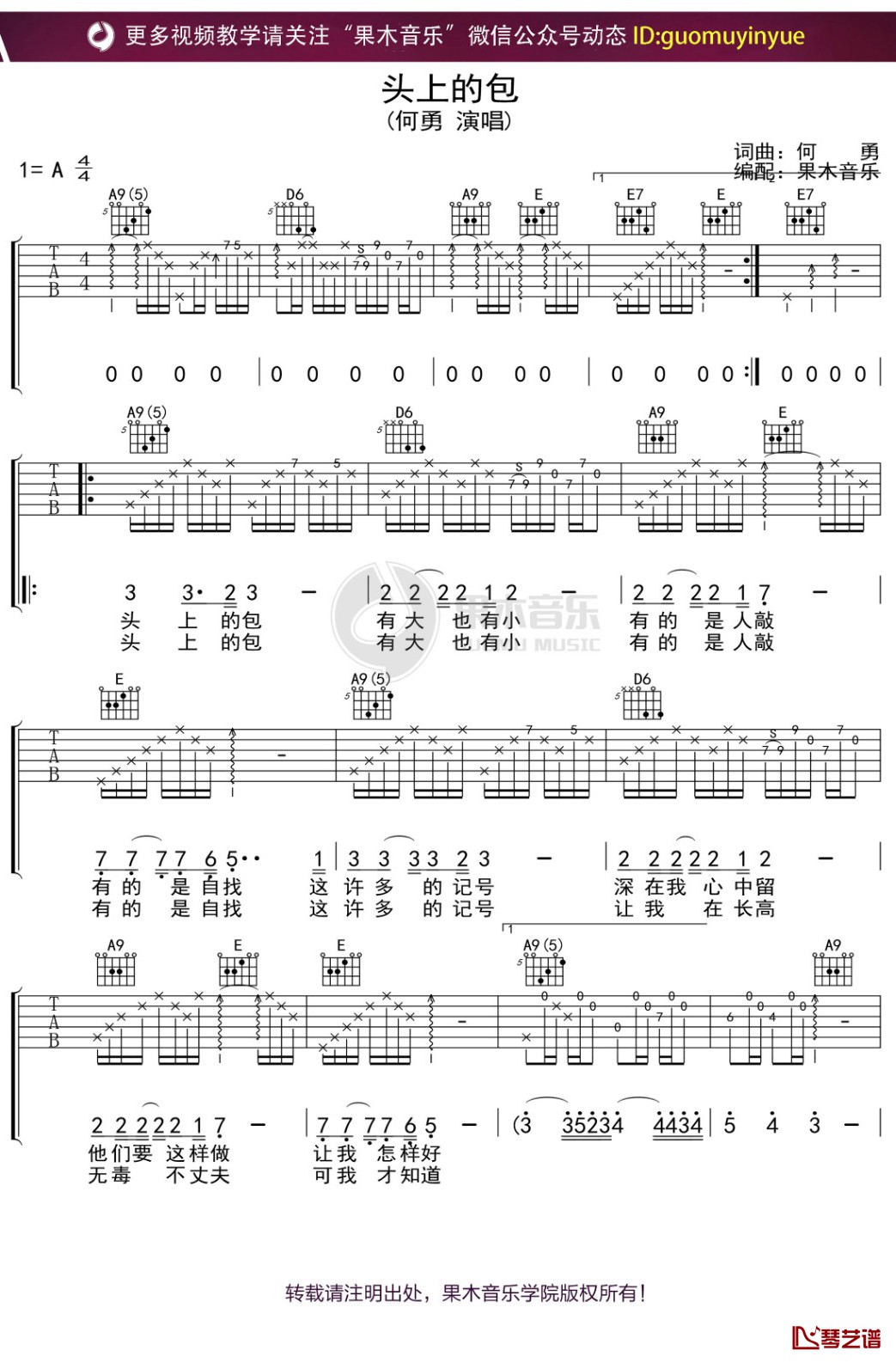曲谱介绍: 何勇《头上的包》吉他独奏谱,共有4张高清图谱。