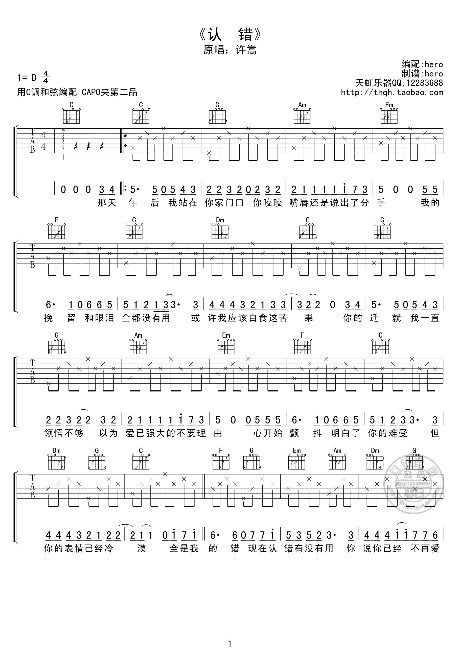 曲谱介绍: 许嵩《认错》吉他谱,原调D,用C调和弦编配,capo夹第二品。一首经典老歌,认错六线谱,高清弹唱图片谱。天虹乐器HERO编配出品,琴谱网网更新上传。 最动人的情歌,只为挽回心上人,一首能让人听到心碎的伤感情歌,它的每一句歌词叙写的内容都是那么真实,那么贴近每一个的内心,使人一听就融入了歌的情境之中。