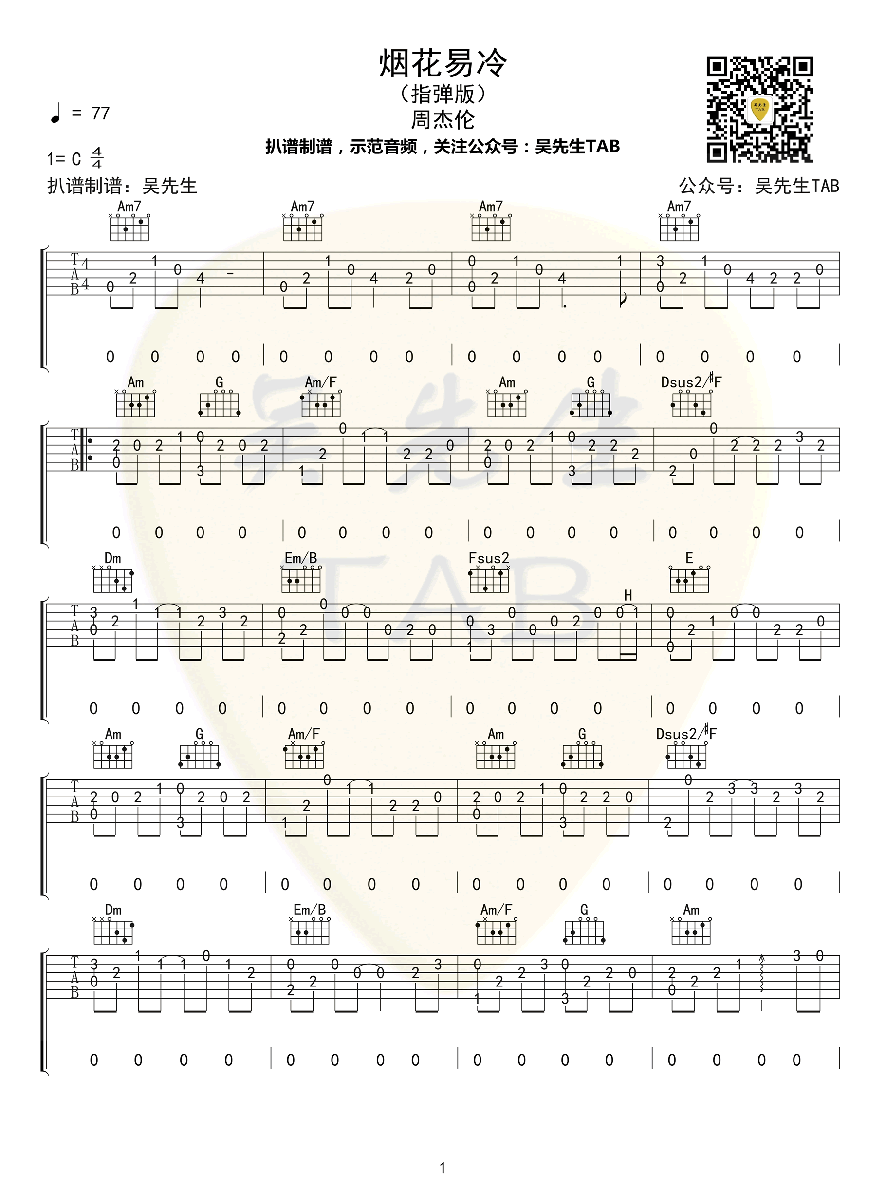 曲谱介绍: 烟花易冷指弹吉他谱,C调编配,周杰伦最具有代表性的中国风歌曲之一。这首歌古典意味浓郁,旋律优美动听,有种凄静幽深感。烟花一时绽放的唯美,却无比短暂。繁华过后,却更多的是落寞。烟花易冷吉他独奏谱,高清图片谱。吴先生扒谱制谱,琴谱网网上传分享。 吴老师的话:我粉上周杰伦还是03年的时候,当时周杰伦刚刚发行《叶惠美》这张专辑。那时候MP3里512M的内存塞满了周杰伦的歌,笔记本上抄满了歌词。周杰伦以前的歌曲不仅曲风大胆多变并且超前,而且歌词暗喻很深,有对残酷青春的反思,也有对伪艺术的控诉等等。这么多年来我唯一到现场看过的演唱会就是周杰伦的演唱会。