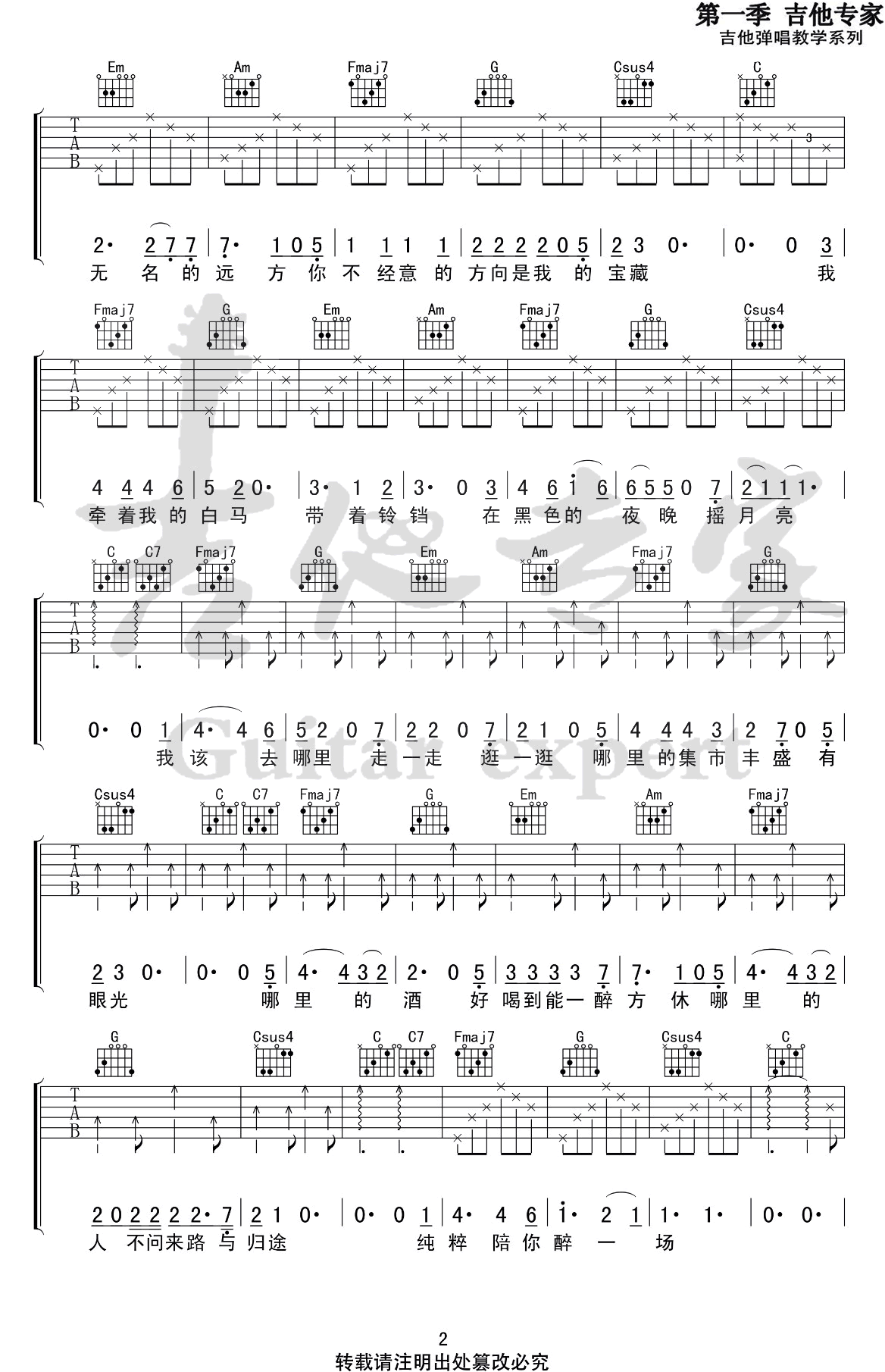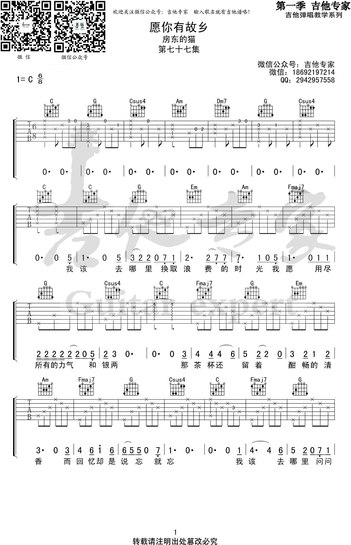 曲谱介绍: 《愿你有故乡》吉他谱,房东的猫演唱的一首新歌,C调弹唱谱,完整版共四张图片谱。愿你有故乡六线谱,感谢吉他专家编配出品,琴谱网网整理上传分享。 《愿你有故乡》这首歌,既有对时光流逝、物是人非的慨叹,又有着最美好的祝愿。 歌词部分实在美好,创作者把故乡视作宝藏,那里有丰盛的集市、有明亮的月亮、有好酒一醉方休、又有清冽的风吹拂面庞…… 跟随着歌声,我们的思绪也跟着飘荡,飘荡。