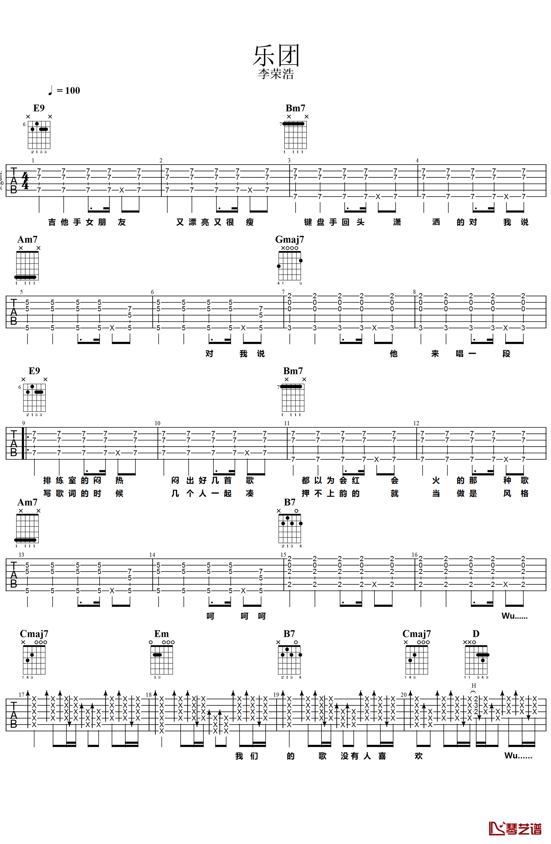 曲谱介绍: 《乐团》是由李荣浩作词、作曲并演唱的一首歌曲,收录于专辑《耳朵》中,发行于2018年10月17日。 《乐团》吉他谱,李荣浩专辑《耳朵》中的一首简洁明朗歌曲,乐团六线谱,高清弹唱图片谱,感谢捷诚吉他教室编配,整理上传,李荣浩的歌曲中,作词作曲这段文字已经是常态了。我们羡慕他的天赋,惊叹他获得的成就,可是却忽视了他默默地坚守。