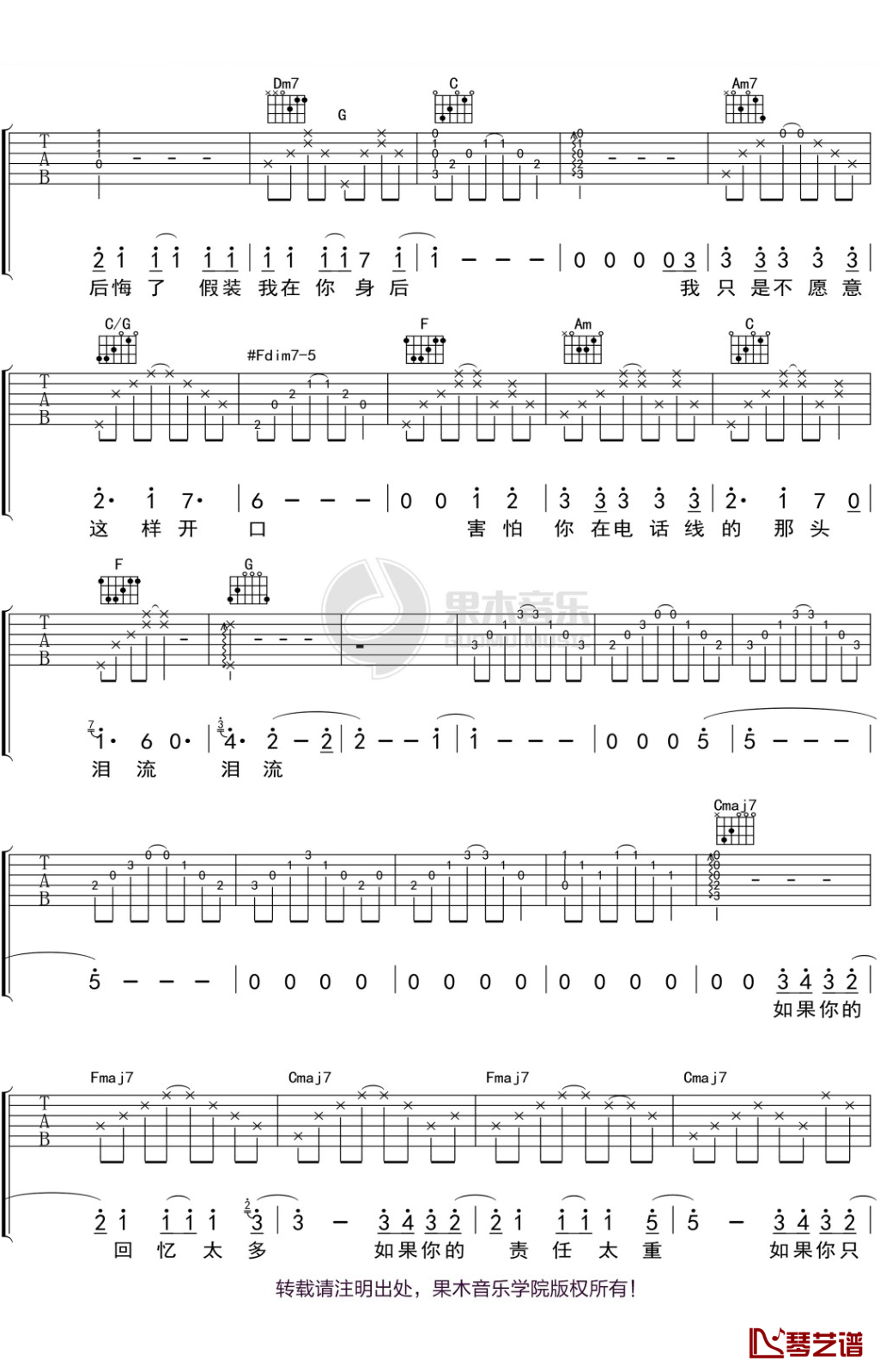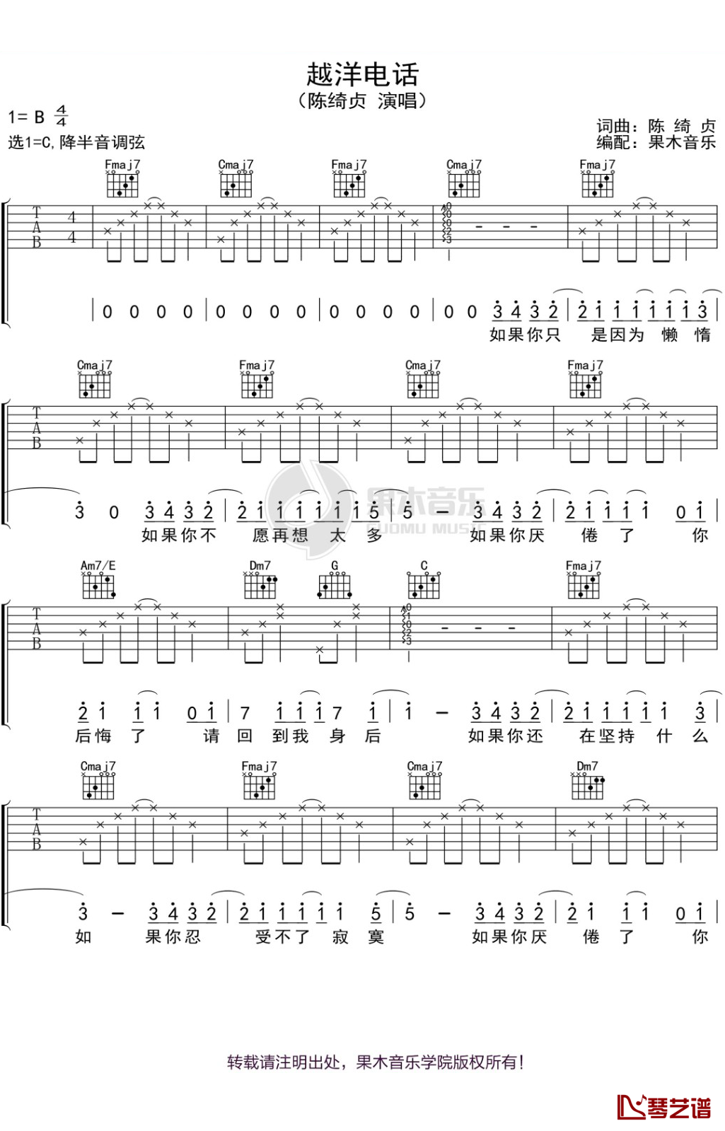曲谱介绍: 陈绮贞《越洋电话》吉他弹唱谱,共有3张高清图谱。