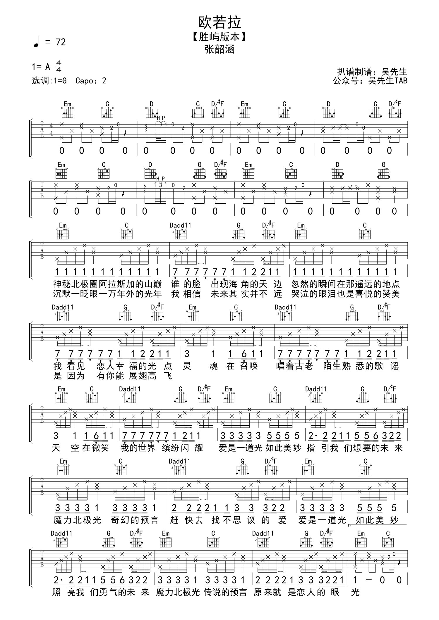曲谱介绍: 张韶涵/胜屿《欧若拉》吉他弹唱六线谱G调版