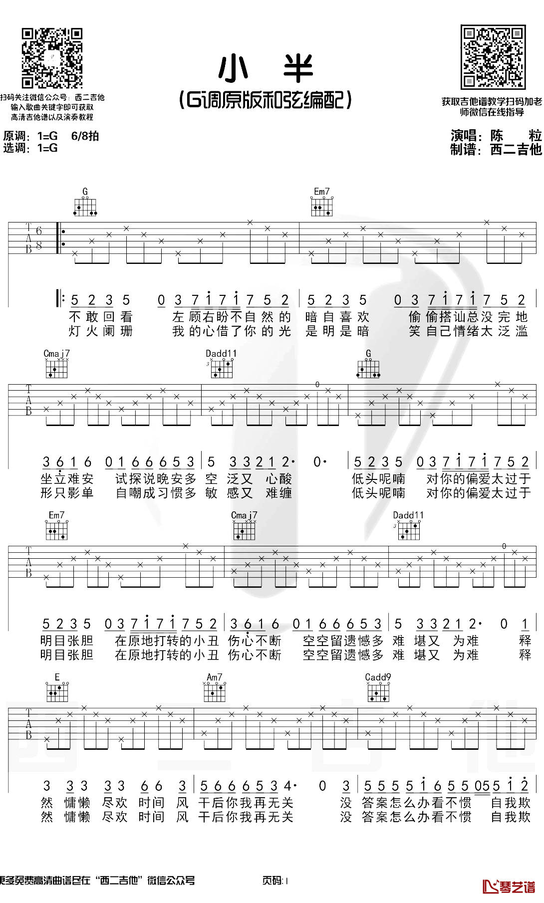 曲谱介绍: 小半吉他谱,采用G调原版和弦编配,感谢西二吉他编配出品,整理上传,小半弹唱六线谱,需要注意的是这首歌是6/8拍的节奏,需要多加练习才能稳定的演奏出来,边弹边唱还是有一点点难度的,下面来看一下火山老师的演奏视频吧!这是一首陈粒演唱的一首代表民谣歌曲--你明目张胆的偏爱就是救赎。传递的大概是,我喜欢你,怕你知道,又怕你不知道,怕你知道又假装不知道。