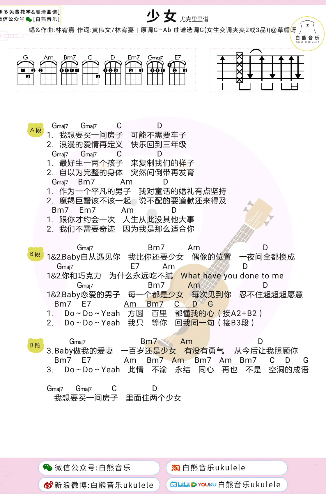 曲谱介绍: 《少女》是林宥嘉演唱的歌曲,于2019年9月24日发布。 这个充满玩味的歌名《少女》是词人黄伟文的构思,想要表达在恋爱中的男人,每一个都会变得像少女。而林宥嘉原本就计划在新专辑中要写一首歌曲送给全天下的恋人,他脑中的画面是下雨天,情侣只能待在家中不能外出,但是两人却放起了音乐一起跳起了肢体不协调、动作丑丑的舞,有点好笑却温暖浪漫。他想帮这样的画面做一首背景音乐,送给包括自己在内的世间情侣。而黄伟文这个为他预留的特别概念,恰巧与他脑中的旋律非常契合,于是两人就词曲搭配,一起共同生长了起来。最后完成的歌词是由黄伟文和林宥嘉共同完成,歌词里描述了许多林宥嘉的人生观,是非常个人且私密的一首歌。而对于林宥嘉提出的《少女》这首歌的概念,让已经离开荧光幕十年的Kiki愿意和先生一起再次走进荧幕。在太太首肯一起工作后,林宥嘉突然灵光一闪,他苦苦寻找的女主角根本就在自己家中,林宥嘉得意的笑说:“从来没想过有天KiKi会成为我MV的女主角,我的家里果然藏着一位仙女”。