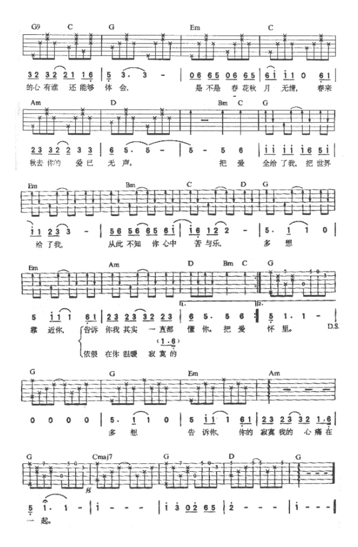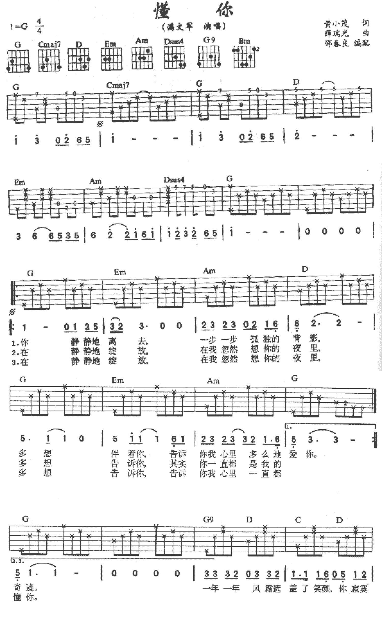 曲谱介绍: 满文军的懂你,歌曲旋律优美,歌词感人至深,是孩子对母亲的怀念和热爱,那种发自内心深处的共鸣震撼每一位听者,是一首感人至深的歌颂母爱的歌曲!懂你吉他谱-满文军歌曲吉他六线谱吉他曲谱为G调。