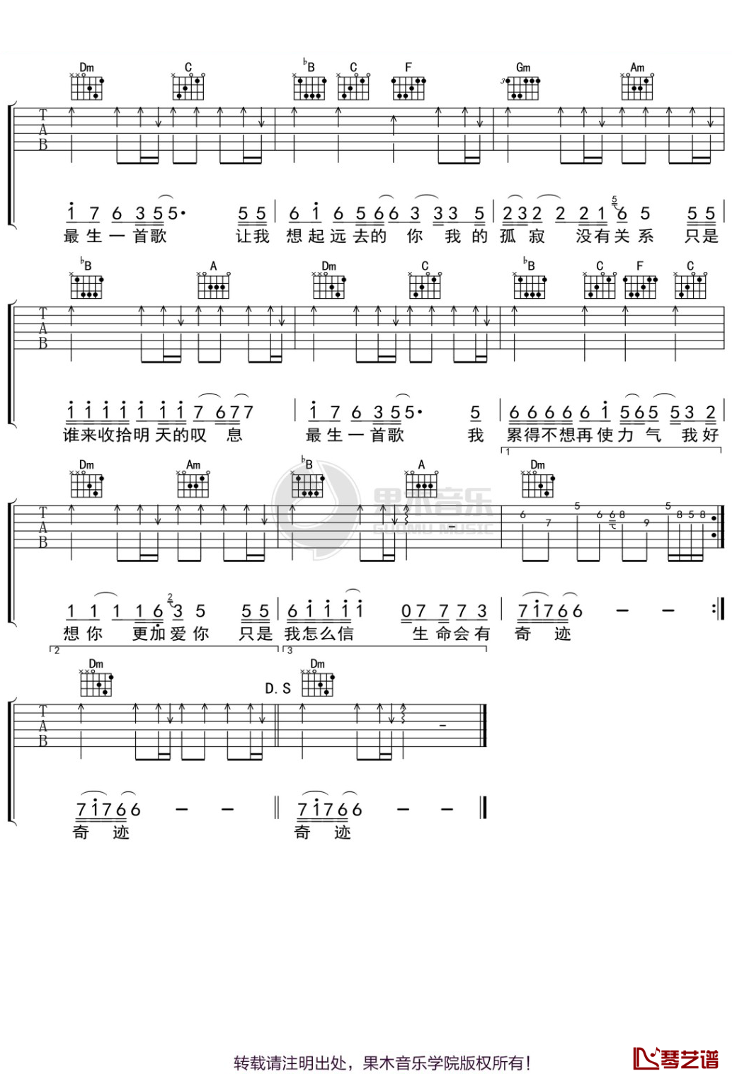 曲谱介绍: 迪克牛仔《最后一首歌》吉他弹唱谱,共有2张高清图谱,免翻页排版设计。