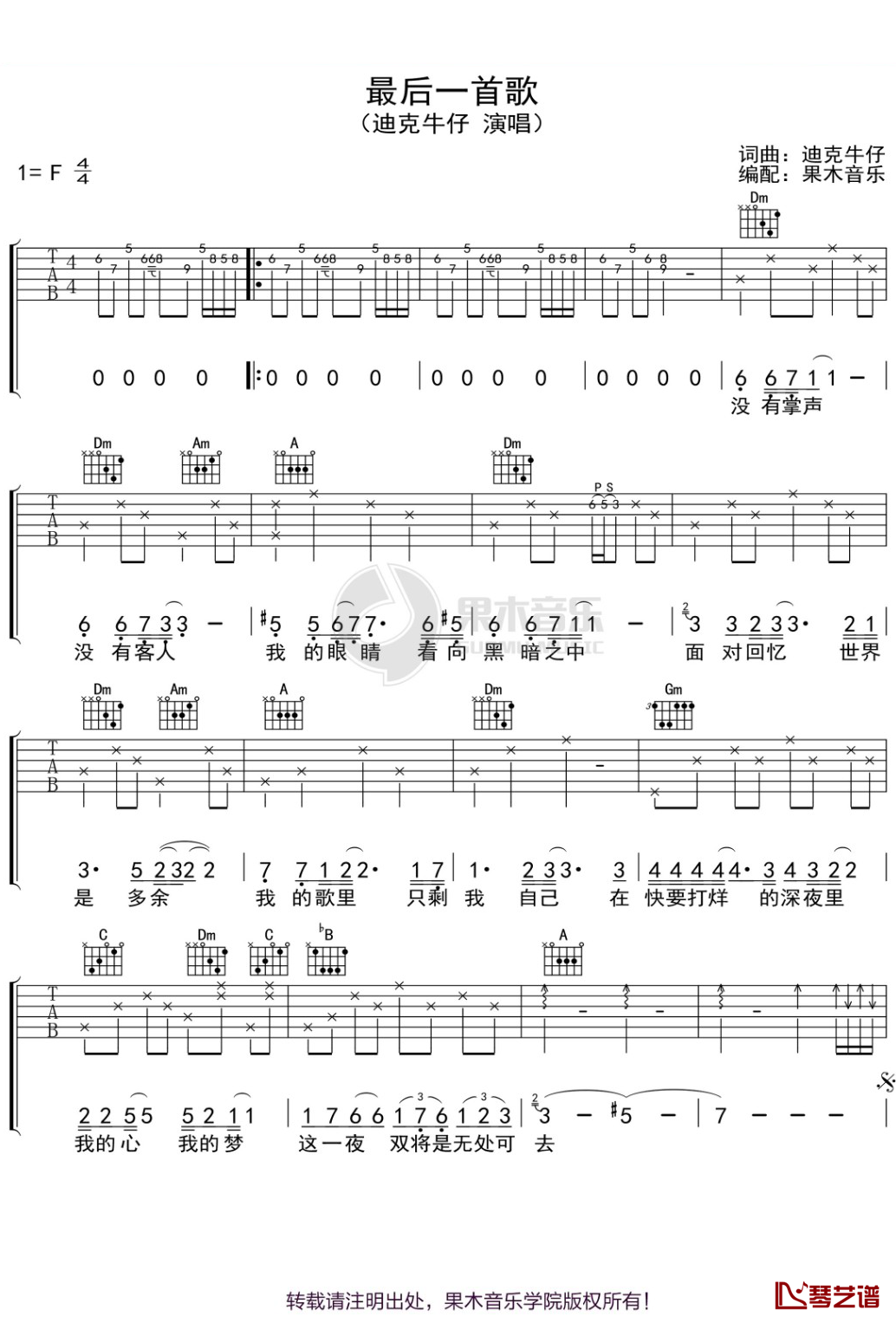 最后一首歌吉他谱 - 迪克牛仔 - 吉他弹唱谱