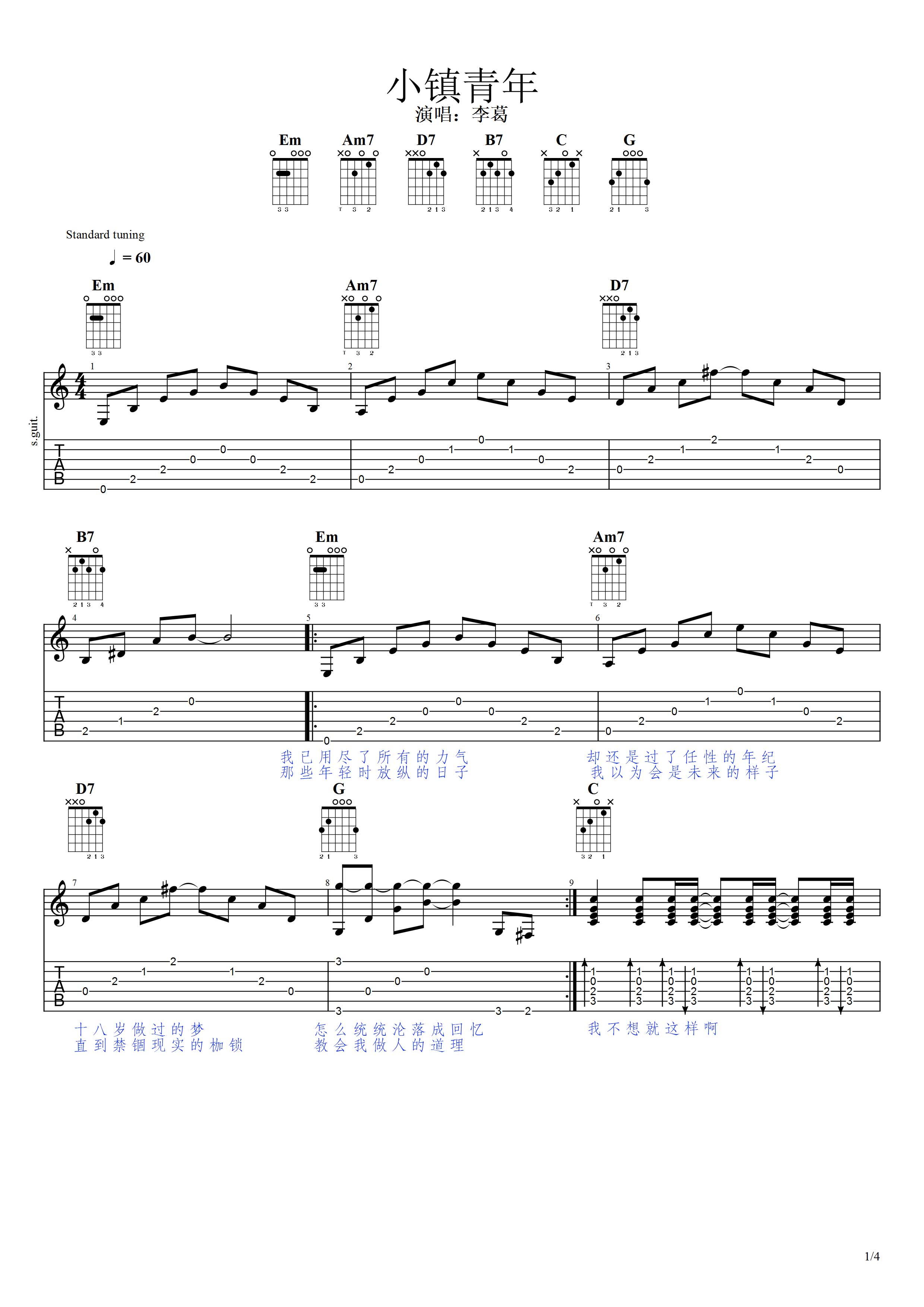 曲谱介绍: 独立音乐人李葛单曲作品《小镇青年》,李葛《小镇青年》吉他谱_弹唱谱_六线谱_民谣_简易版